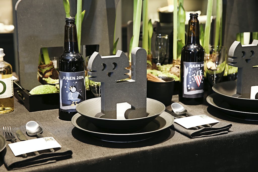 Jakob Kühnel viser årets Julemærke Jakob Kühnel er designeren bag årets julemærke, og hans bord er ligesom mærket, klassisk med et moderne tvist. På bordet ser vi to elge, mens fine, håndskårne katte kigger frem bag tallerkenerne, hvor der serveres risengrød. Julerøde amaryllis giver den rette julekontrast.