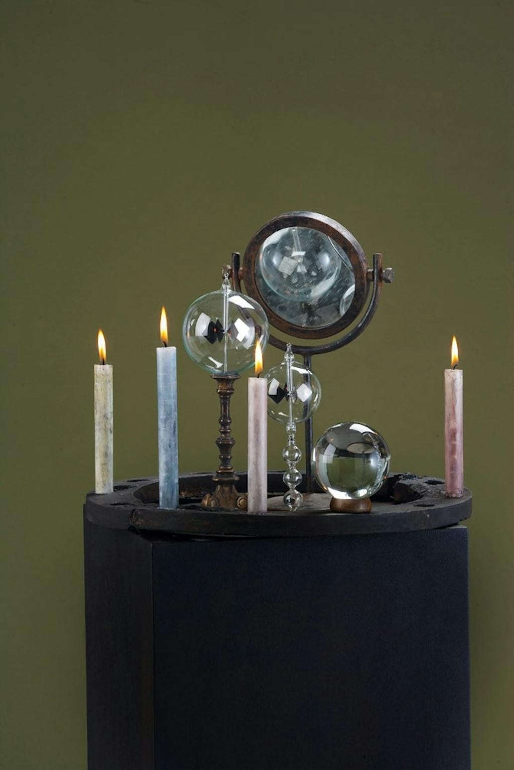 Oliver Gustav har skabt adventskransen af den oven- nævnte søjle, en jernkrans, to særlige radiometre, et spejl, en krystalkugle og fire hjemmebejdsede lys.