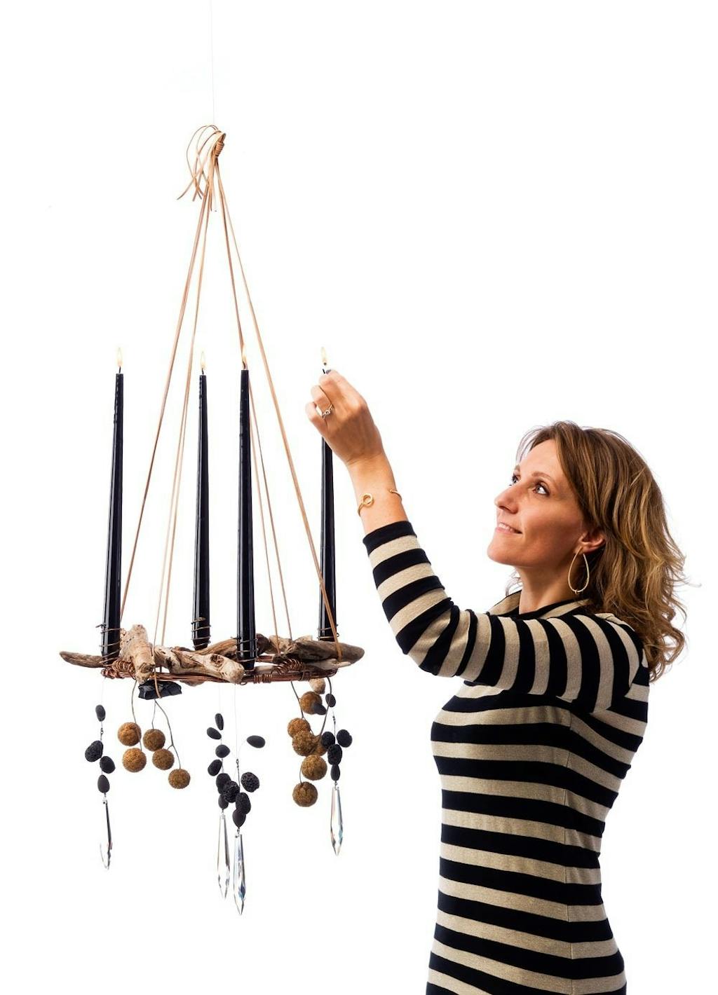 Kransen er bundet af drivtømmer fra Bornholm og kobbertråd påhængt lavastykker, platankapsler og prismer. Kransen er bundet op i flade lædersnore og har kulsorte laklys.