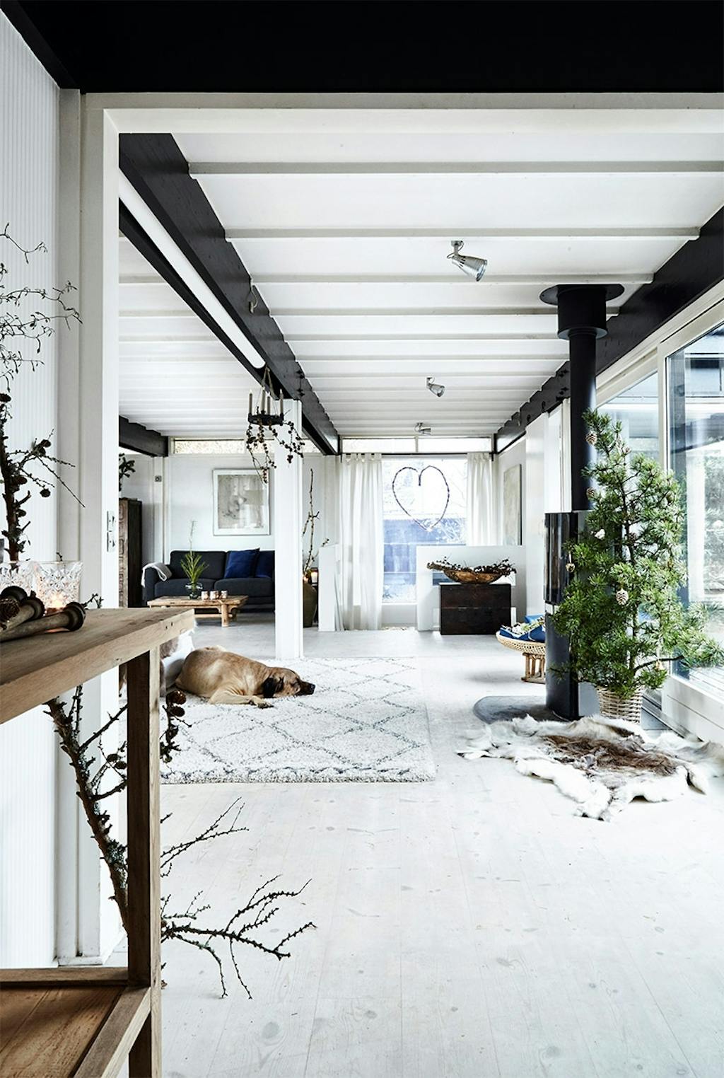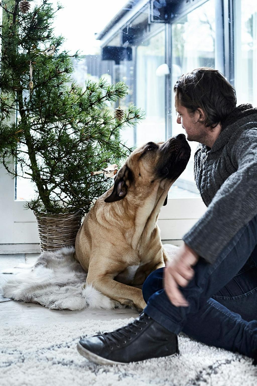 Aslan nyder varmen fra brændeovnen på et lunt rensdyrskind. Juletræet bagved er en nedfalden gren fundet i skoven, som er blevet dekoreret med julepynt fra Rema og Georg Jensen.
