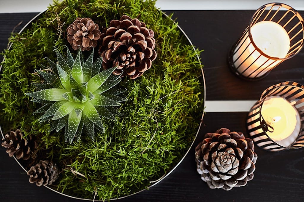 Den sortmalede bænk fra Ikea bruges normalt både som konsolbord og siddeplads. I disse dage holder en smuk grøn juledekoration af mos, kogler og en sukkulent til her.