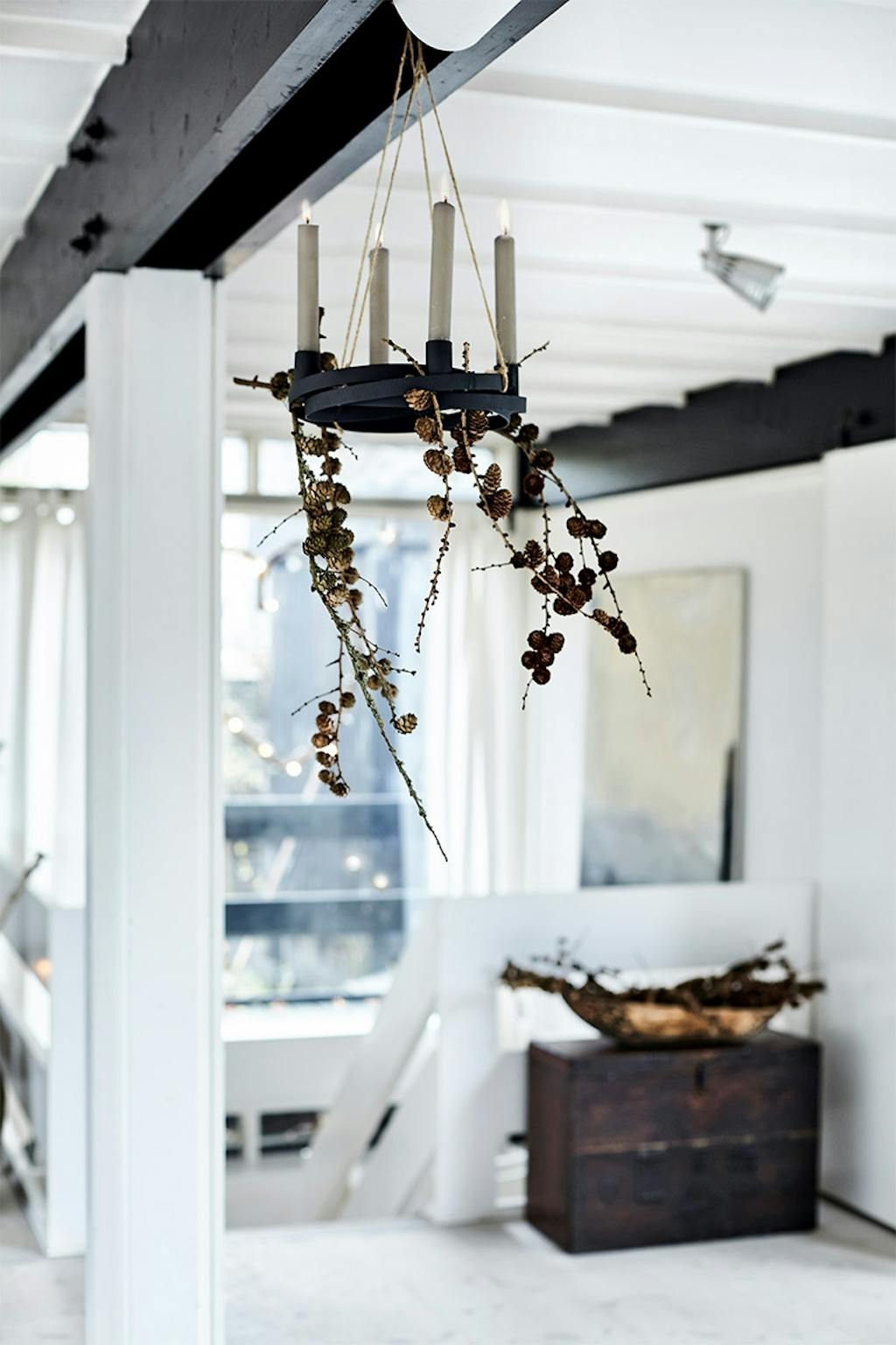 – Jeg hygger mig med at pynte op til jul, så det er meget naturligt mig, der står for det. Men at hente og pynte juletræet gør vi sammen alle fem lillejuleaften, og det er en hyggelig tradition, siger Tine, der pynter op med naturmaterialer, som spiller godt sammen med de naturskønne omgivelser, som kan nydes overalt i huset via store vinduer. Små og store grantræer og birkegrene bliver puttet i de gamle stentøjskrukker, og rustikke trætrug bliver fyldt med kogler, mos og lærkekviste.
