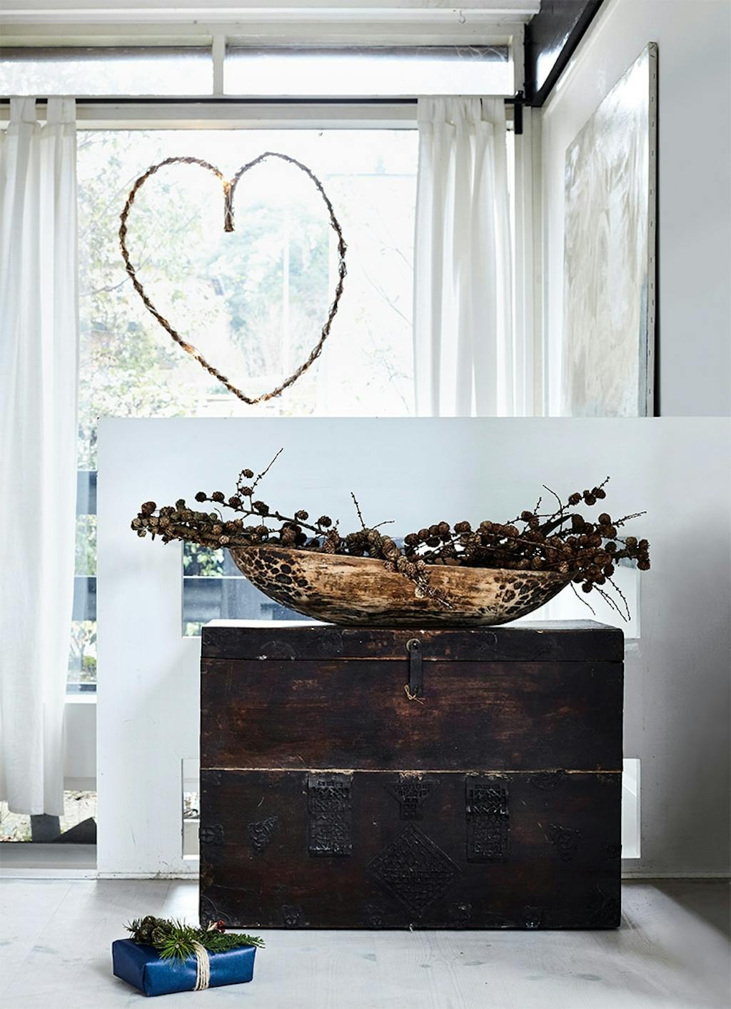 Den gamle rejsekiste i gyldent patineret træ er fra Vietnam, ligesom træfadet, der nu i juledagene er pyntet med lærkegrene.