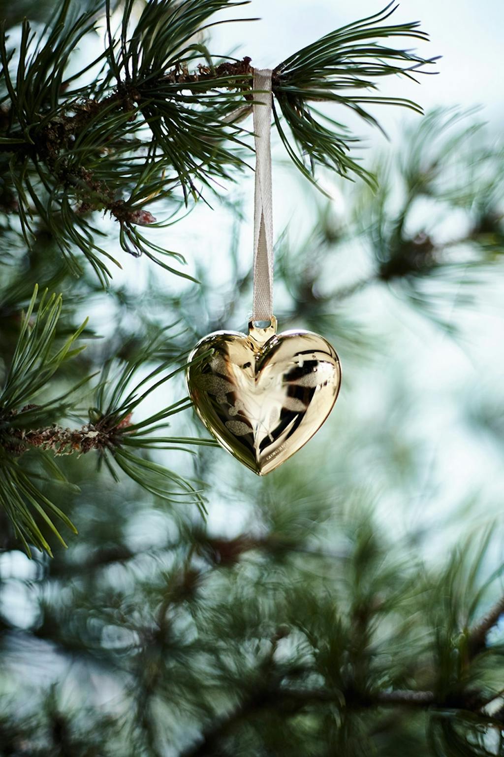Et julehjerte fra Georg Jensen pynter på juletræet – en nedfalden grangren fra skoven.