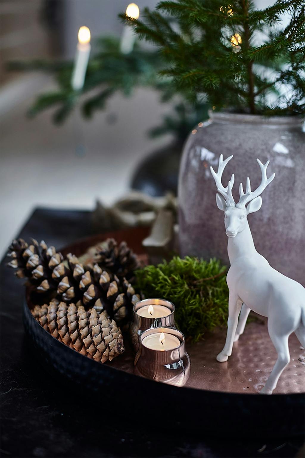En gammel asiatisk rejsekuffert bruges som bord for Tines hyggelige stilleben med en bakke og en vase fra Broste Copenhagen, en hvid porcelænshjort og små fyrfadsstager fra Georg Jensen. Den rustikke krukke med grangrenen er fra en rejse i Østen.