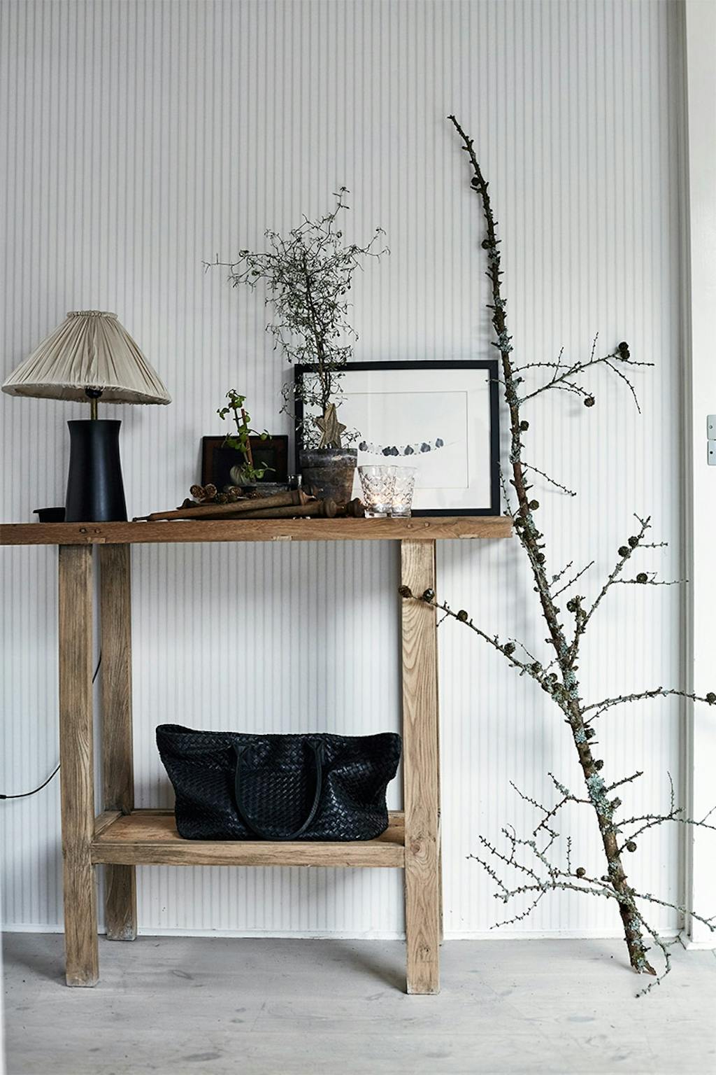 I entreen byder et smalt konsolbord velkommen. Også her har julehyggen sneget sig ind i form af en enkel lærkegren og små fyrfadsglas.
