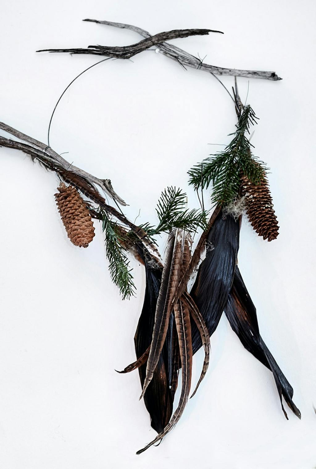 Hjemmelavet vægpynt af grankviste, fjer og kogler.