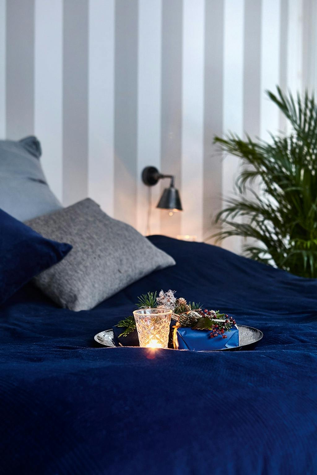 Den blå time i soveværelset. Sengetæppe og puder er fra Ikea, tapetet på væggen er fra Ellos.