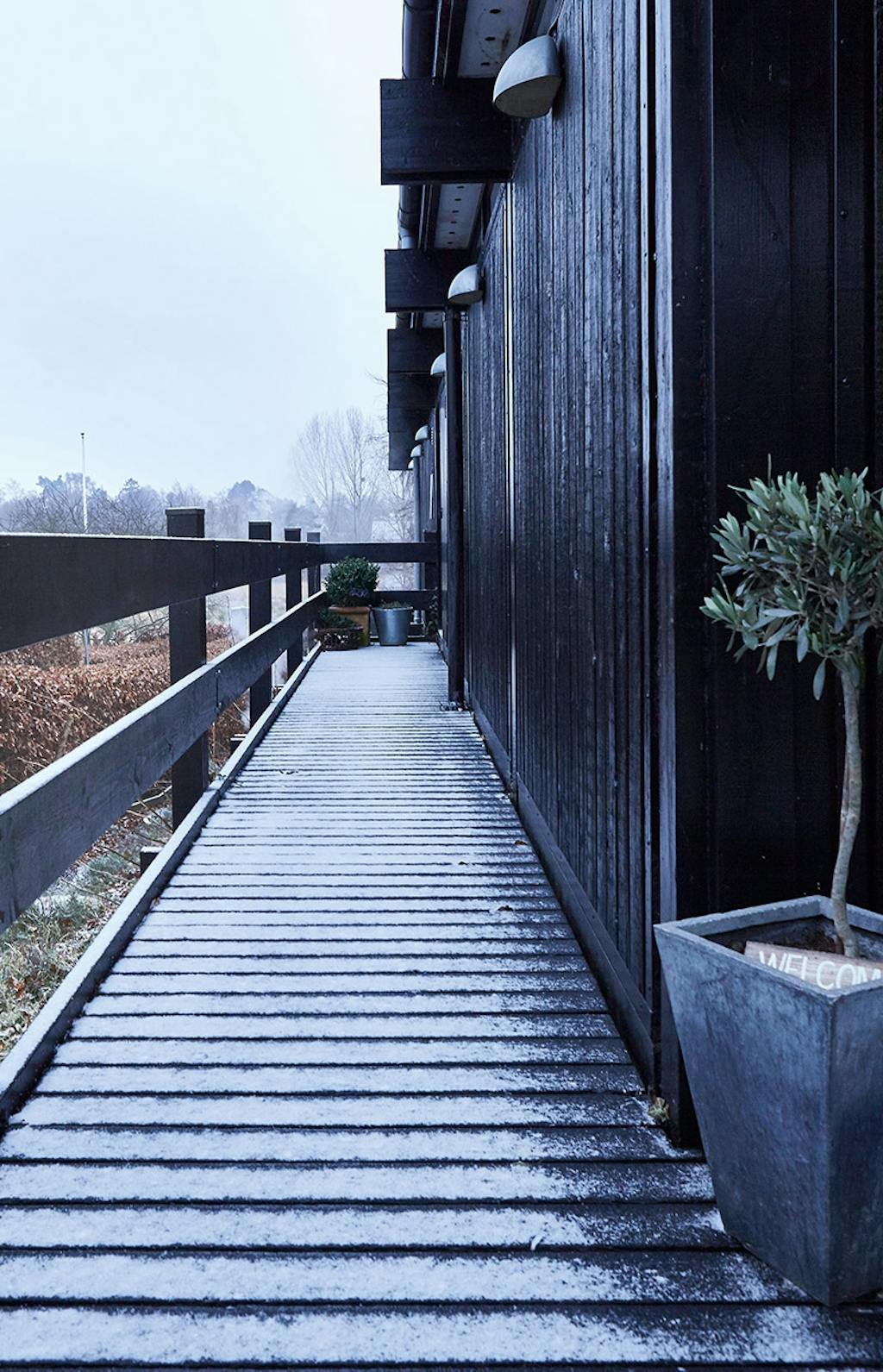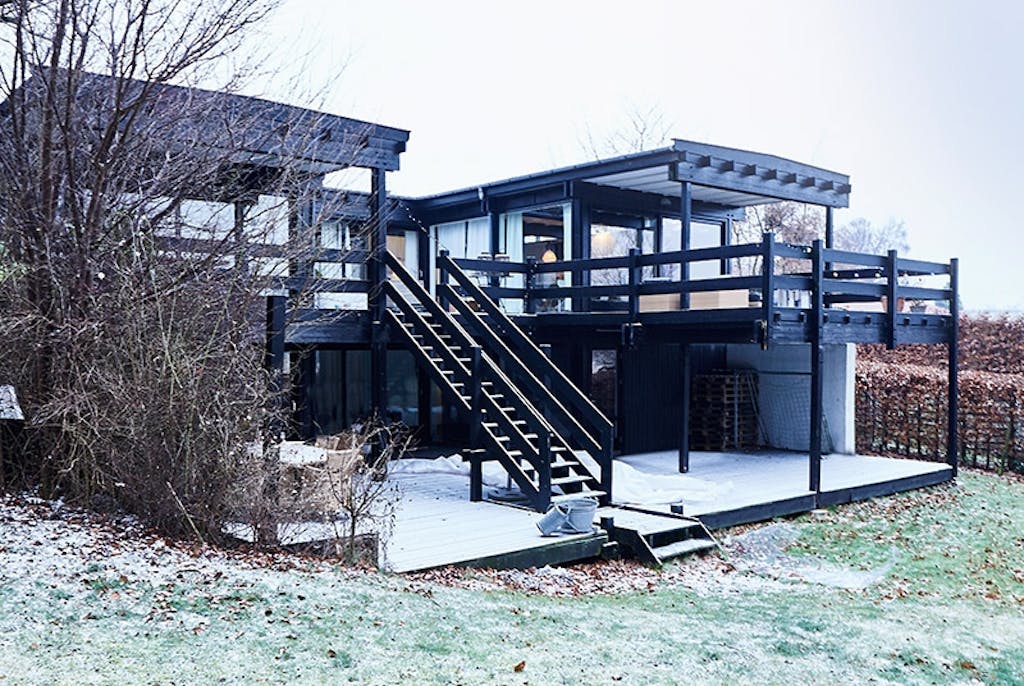 Alle værelser i den sortmalede trævilla har udgang til en terrasse.