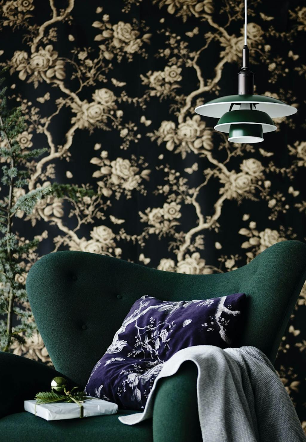 Lænestolen Den Trætte Mand, designet af Flemming Lassen i 1935, polstret i uld Interglobe Standard, 22.995 kr., By Lassen. Pude betrukket med tekstilet Designers Guild Ashfield Floral Windsor Purple, i velour, 1430 kr. pr. m, ZenOut Home. Uldplaid, SeedStitch Silver, 80% uld/20% polyamid, 170 x 130 cm, 1449 kr., Strikaholic. Pendel, PH 31⁄2 - 3, design Poul Henningsen, metalskærme med ophæng i silkemat brun kobber, 5495 kr., Louis Poulsen. Tapet, Designers Guild Ashfield Floral Tobacco, 995 kr. pr. rulle, ZenOut Home.