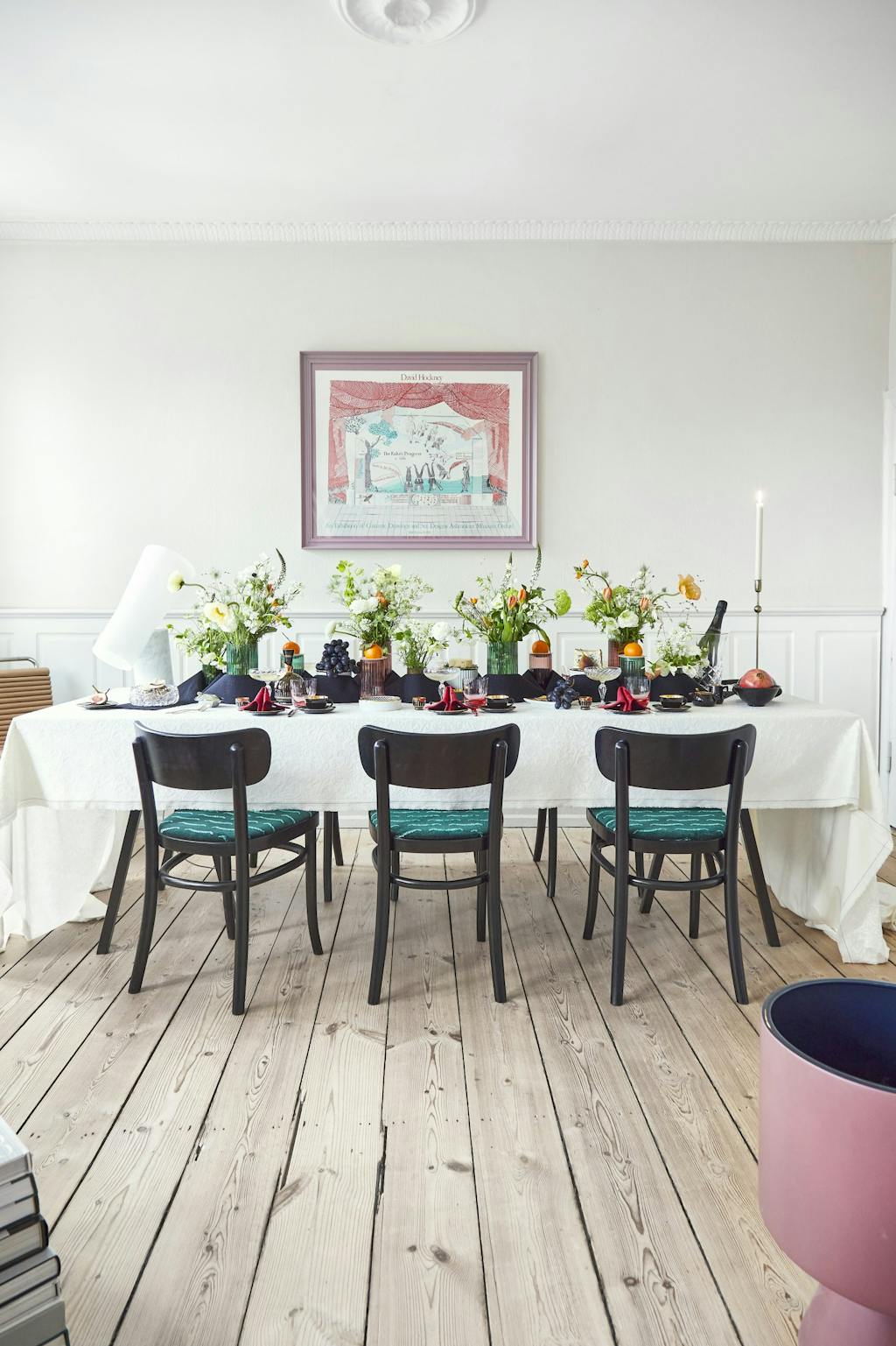 – Jeg har tilstræbt en slags “barok-møder-skandinavisk-enkelhed-og-mådehold”, og jeg synes, der er lidt nature morte-maleri over opdækningen med den sorte løber, der giver en dramatisk dybde og iscenesættelse.