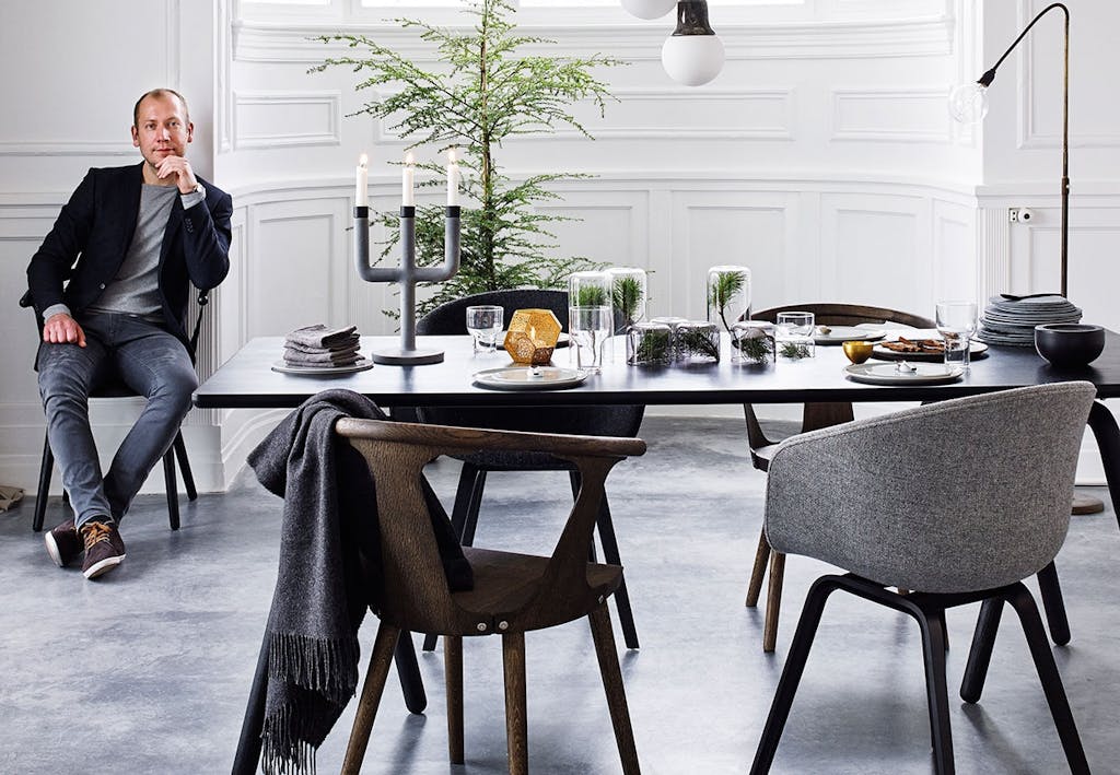 ‑ Jeg har et ret afslappet forhold til jul, og derfor bryder jeg også gerne med de gængse normer og prøver nye design og muligheder af. I år har jeg fx dækket bordet lidt asymmetrisk og med forskellige former for glas, service og stole, fortæller Jonas Bjerre-Poulsen fra Norm Architects.