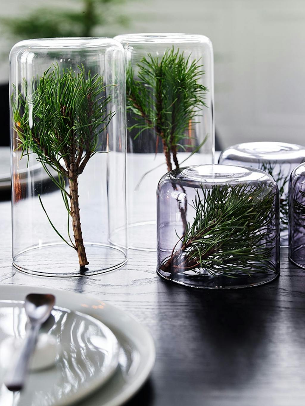 Dækketallerkener i skiferbrud, skåle og tallerkener i stentøj, glas i forskellige størrelser, en kandelaber i beton, skeer i horn og små dekorative fyrretræsgrene i glasbeholdere er blot nogle af de ting, vi ser på bordet. Fra loftet, højt hævet over glas og tallerkener, supplerer en klyngelampe, med syv pendler i blankpoleret marmor og opalglas, fyrfadsstagerne fra blandt andre Tom Dixon på bordet.