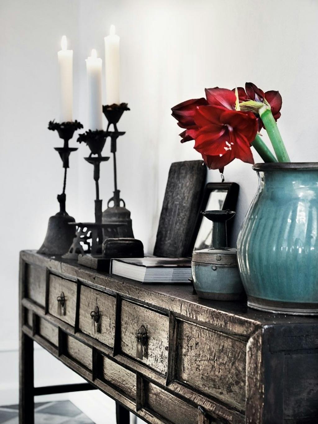 Der hersker med andre ord en overraskende harmoni mellem de ærkedanske rammer moderne møbler og kinsesiske antikviteter. En særlig æstetik, som Ida Rosenvinge Türner formår at få frem, og som også gælder, når hun pynter op til jul. På alle dørene bliver der hængt grønne kranse, og adventskransen har sin faste plads ved skrivebordet. Friske buketter og masser af stemningsfulde stearinlys har jeg året rundt, men i december køber jeg ofte amaryllis og juleroser. Jeg går ind for elegant og naturlig enkelhed også til jul, fortæller hun.