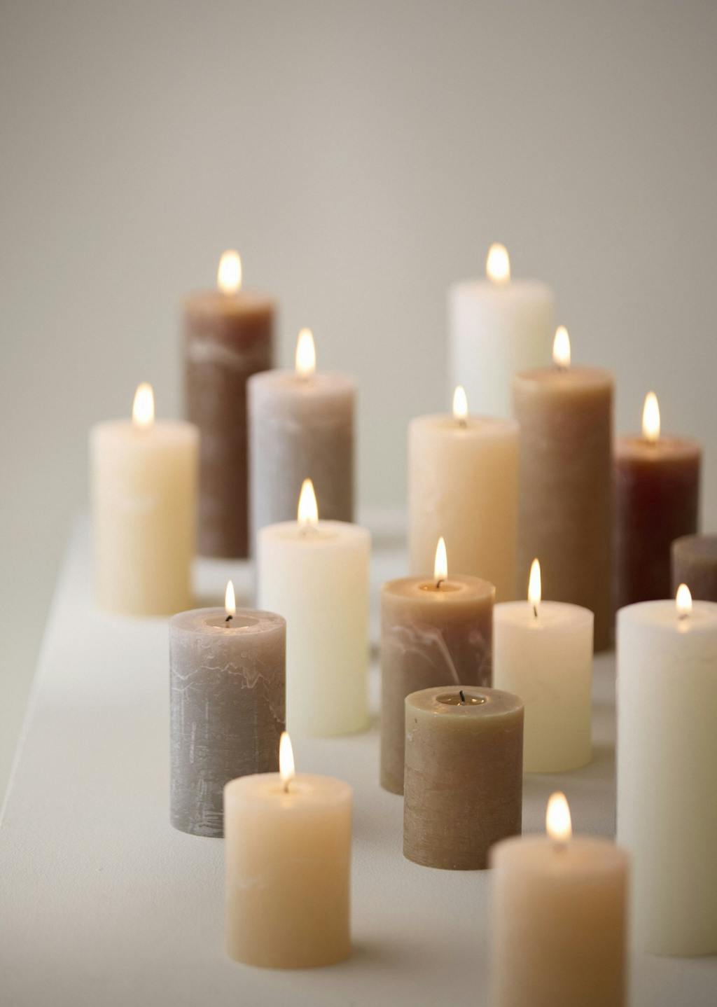 Skab et landskab af levende lys i forskellige nuancer af den samme farver, brug brune lys i den grønne adventskrans eller brug grønne lys på julebordet som nik til juletræet. Mulighederne er uendelige med de farvede lys.