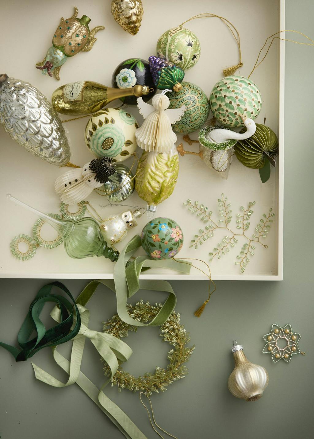 TIP: Har du sølv- eller guldornamenter, kan du sagtens få dem til at passe ind i det grøn/brune tema ved at hænge dem op med smalle silkebånd i de to farver.