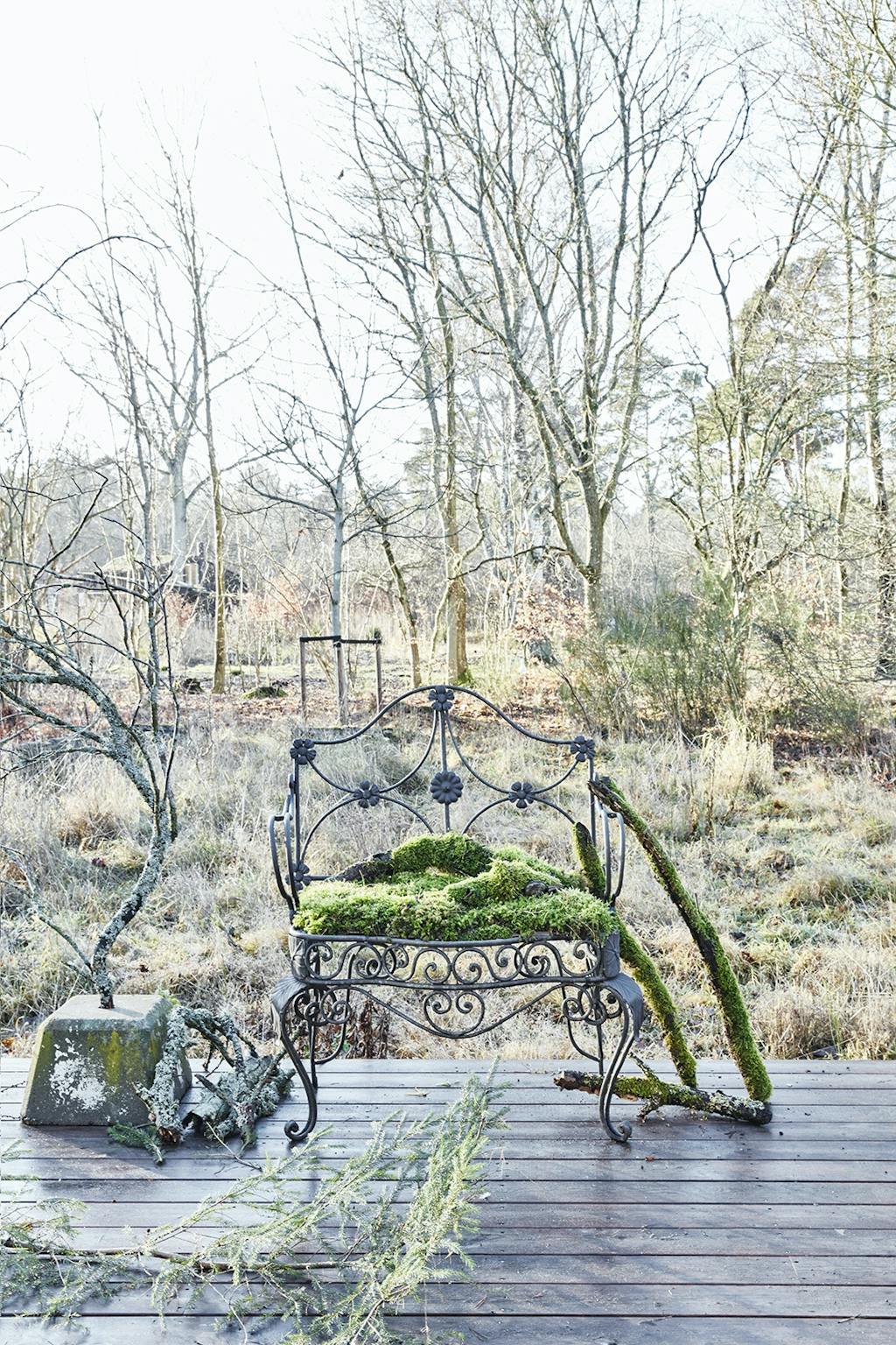 Et tableau på terrassen er lavet af en dekorativ jernstol med en pude af tykt, blødt mos og en gammel parasolfod, som er brugt som holder for en flot gren dækket med mos.