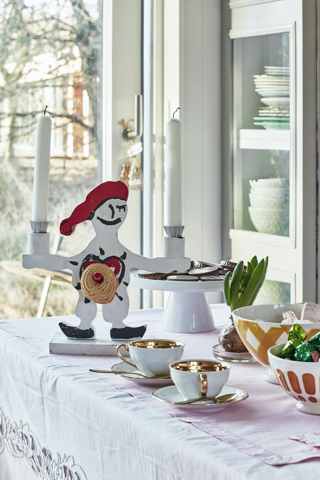 Gamle, fine kopper med guld, franske kaffeskåle, en porcelænsopsats fyldt med kager og en skøn, meget glad nisse byder velkommen på bordet. Nissen er lavet af Sunny Asemota.