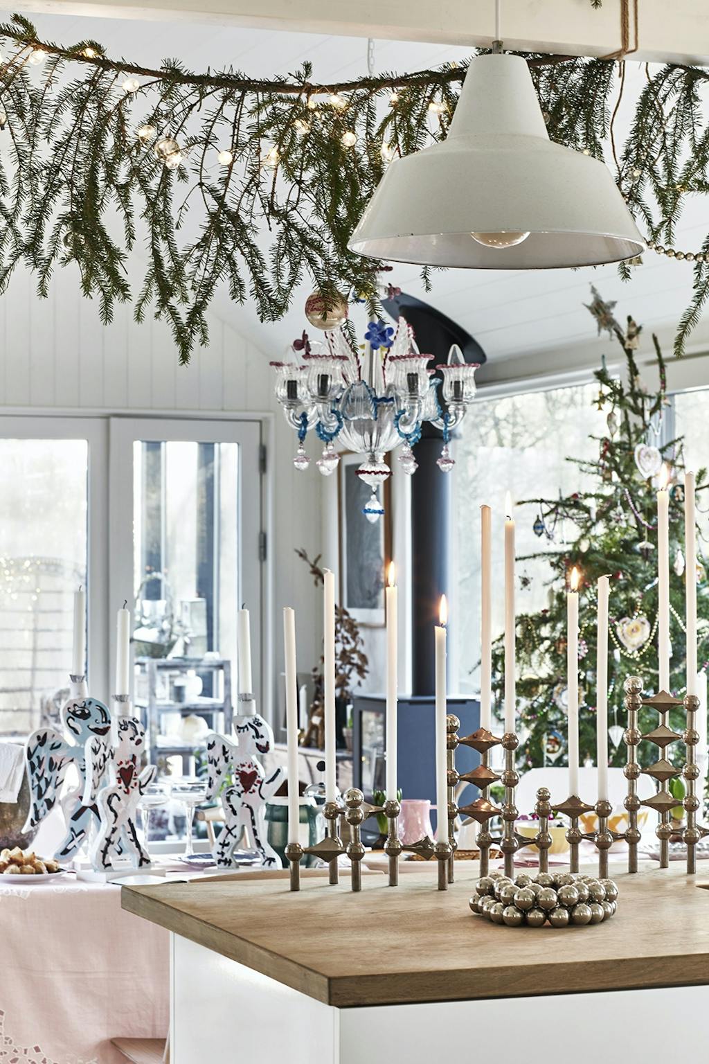 Grangrene med lyskæder skaber julet hygge. En stor samling Nagel-stager står tændt med lange, slanke stearinlys.