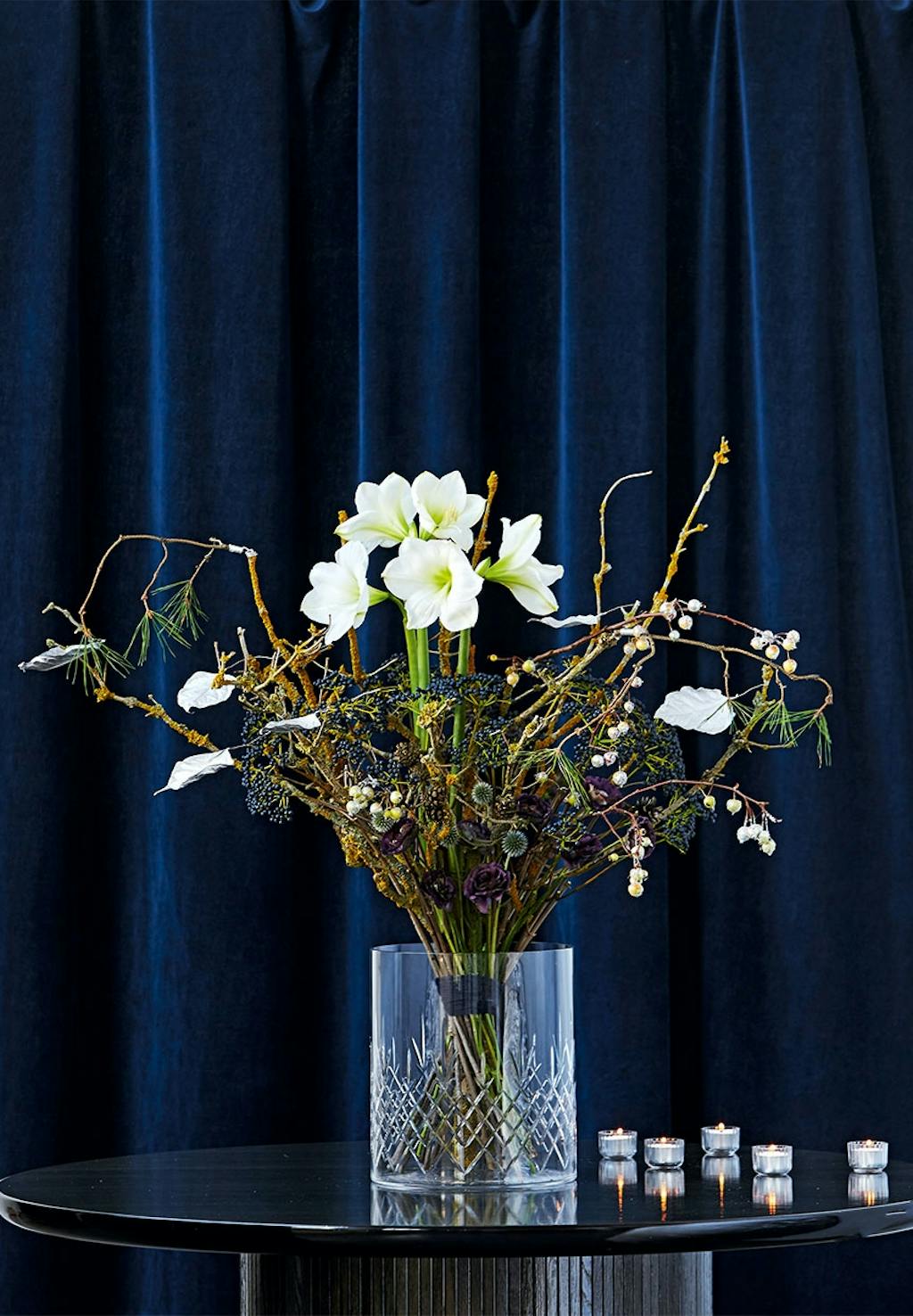 De høje amaryllisser er hovedpersoner i en moderne julebuket bundet i flere niveauer, således at hver blomst træder frem i sin form. Buketten kræver lidt øvelse at forme/binde.