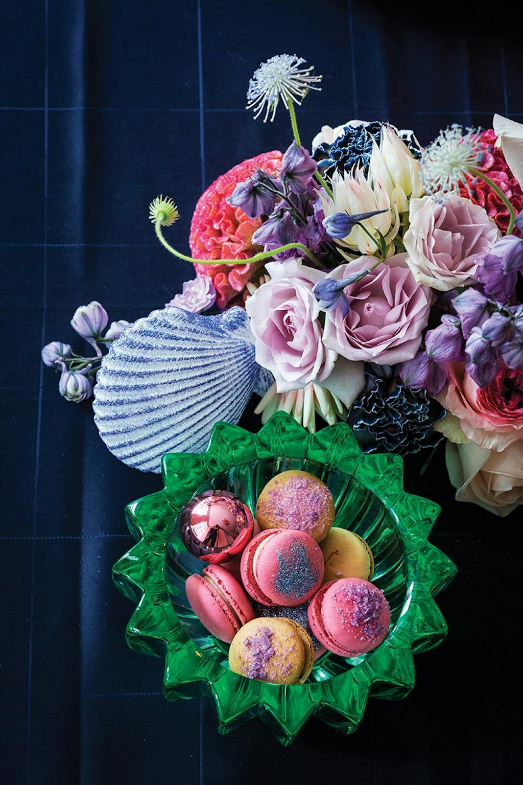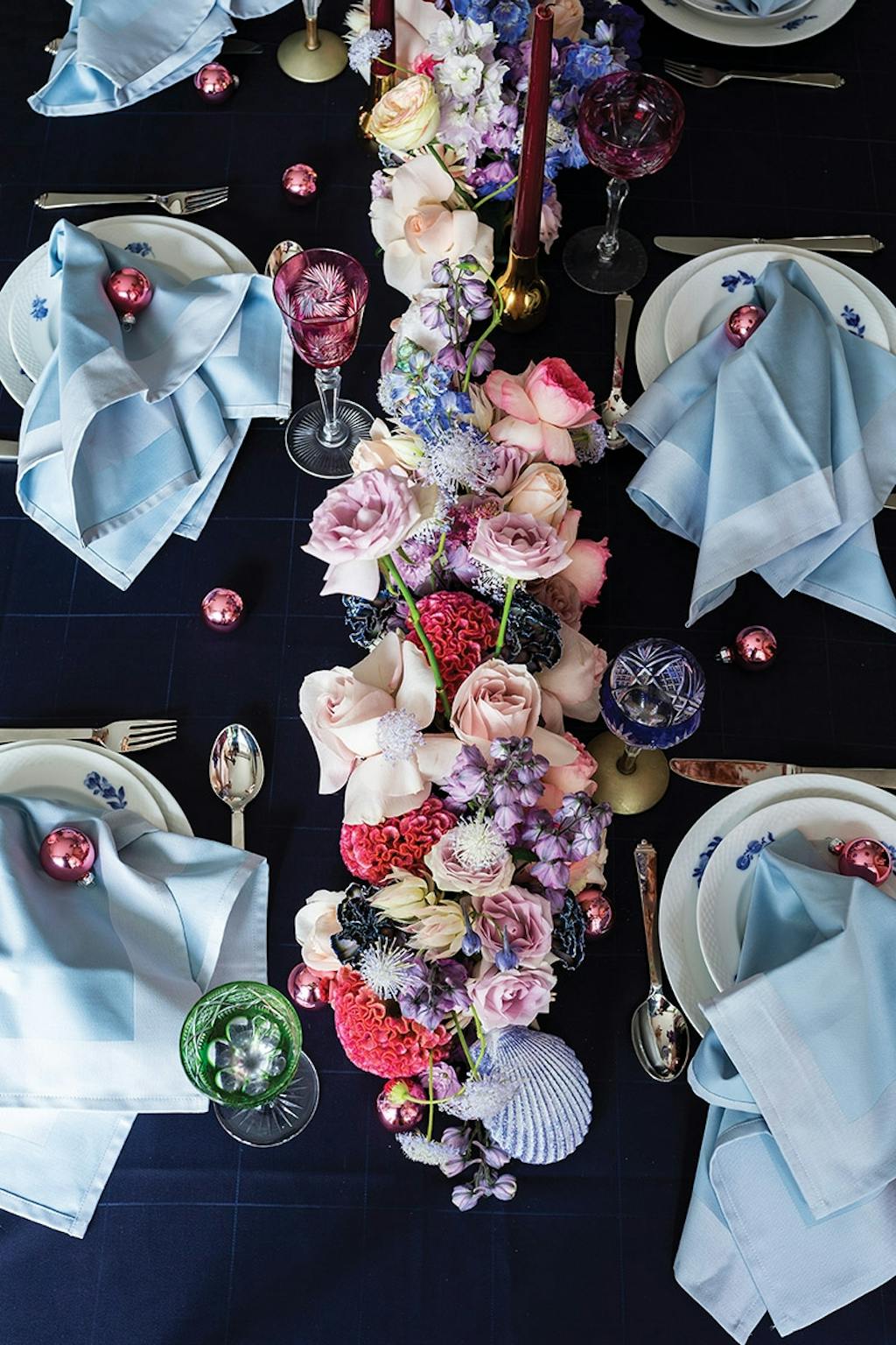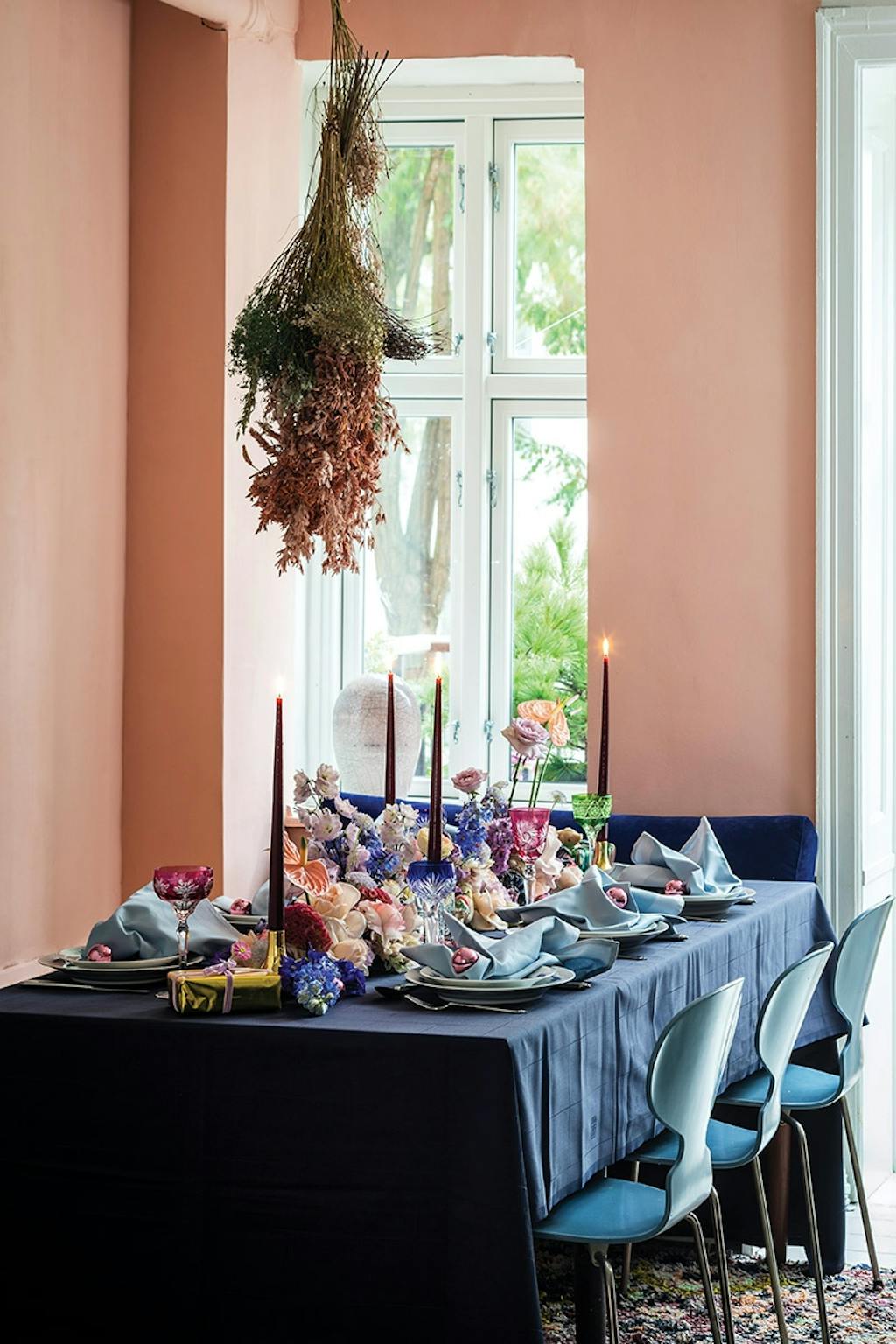 Det er første gang, at Poppykalas holder jul hjemme hos sig selv på Vesterbro, så julebordet skal reflektere familiens værdier. Det gør det med den eventyrlige sammensætning af farver og blomster, og den legende stemning, der giver plads til hendes to døtre, Sonja på fem og Iris på to. Bordet er dækket med en blanding af nyt og vintage-arvestykker, der også gør julebordet både personligt og familiært. Dugen er fra Georg Jensen Damask, stellet er arvet blå blomst fra Royal Copenhagen, bestikket er Georg Jensens Pyramide, mens de smukke, farvestrålende vinglas er antikke.