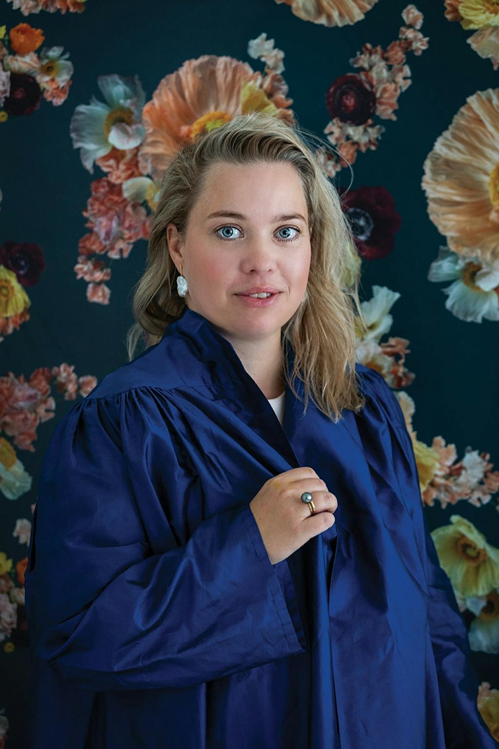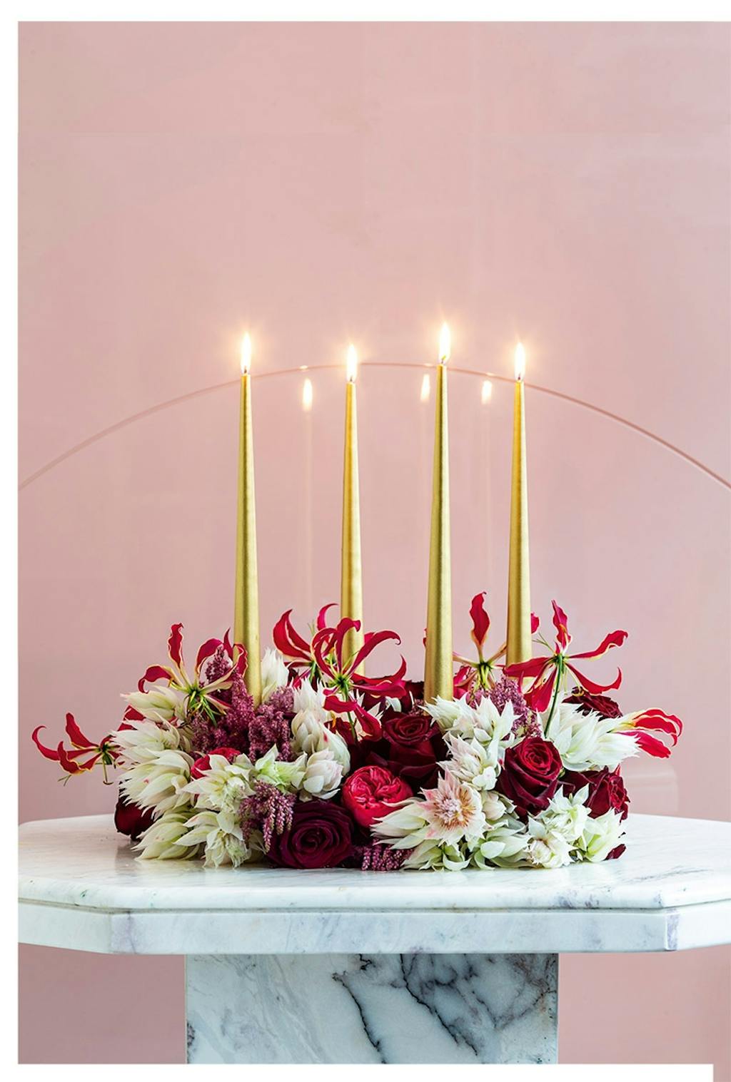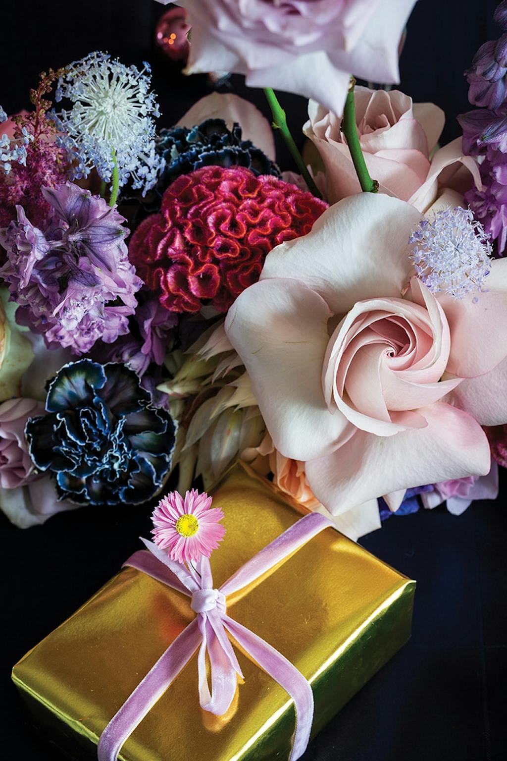Det er første gang, at Poppykalas holder jul hjemme hos sig selv på Vesterbro, så julebordet skal reflektere familiens værdier. Det gør det med den eventyrlige sammensætning af farver og blomster, og den legende stemning, der giver plads til hendes to døtre, Sonja på fem og Iris på to. Bordet er dækket med en blanding af nyt og vintage-arvestykker, der også gør julebordet både personligt og familiært. Dugen er fra Georg Jensen Damask, stellet er arvet blå blomst fra Royal Copenhagen, bestikket er Georg Jensens Pyramide, mens de smukke, farvestrålende vinglas er antikke.