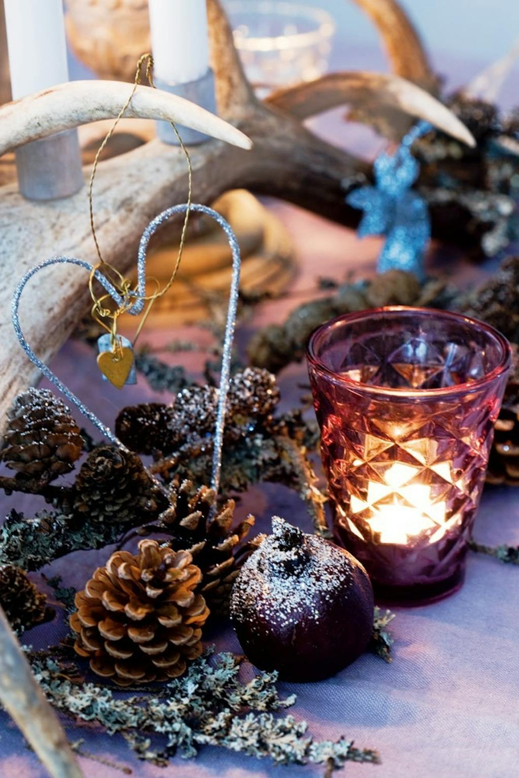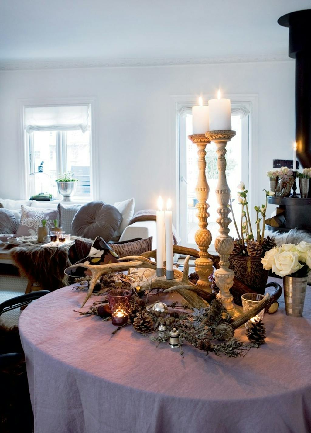 Julestemningen slås an med naturens egne materialer. Pels, træ, levende lys og farver, som er holdt i dæmpede pastelfarver skaber en eventyragtig og ekstremt hyggelig stemning i lejligheden.