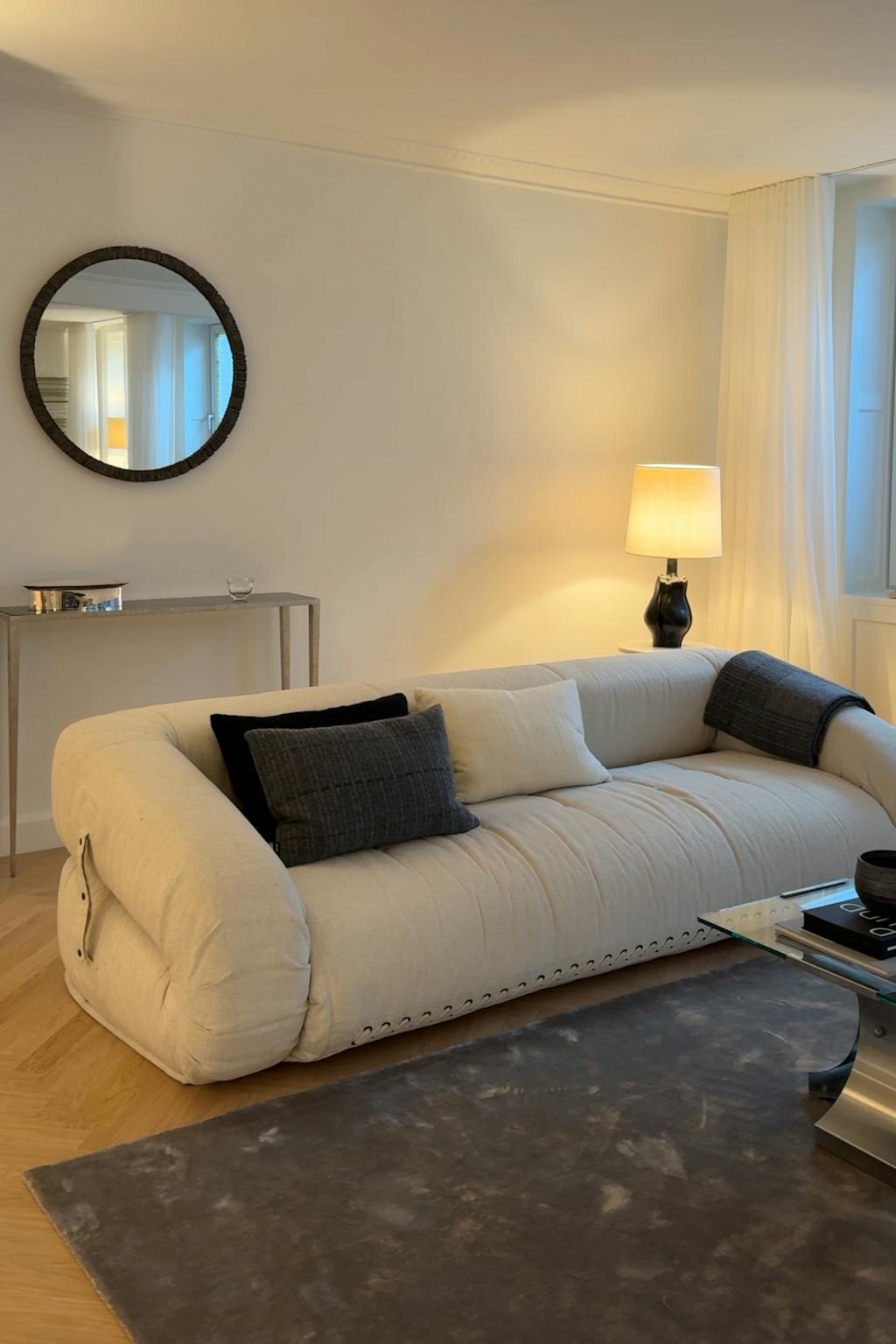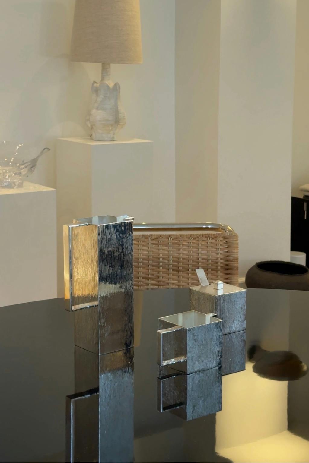 Lejligheden er et kombineret showroom og butik, hvorfor objekterne – som altid – er nøje kurateret til universet. Der er både store møbler som sofaer og borde, men det er særligt designobjekter i stål og keramik, de gør sig særligt godt i.