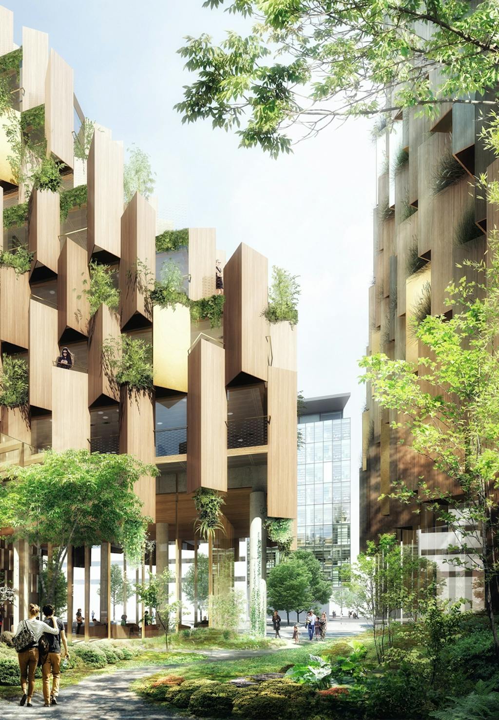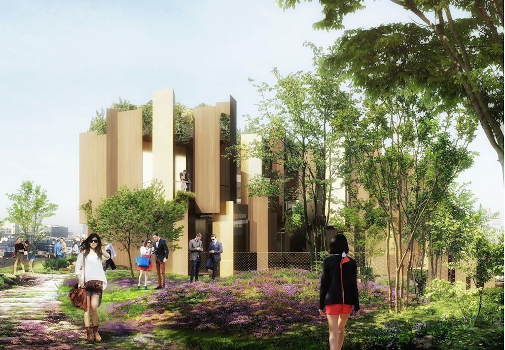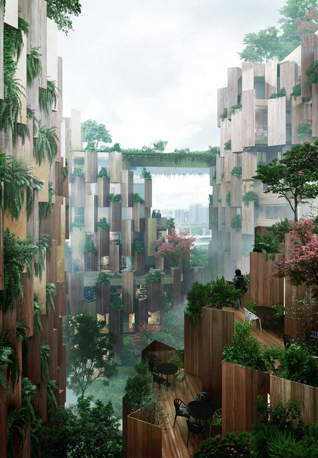 Frodige planter flyder ud mellem træblokkene på arkitektfirmaet Kengo Kuma & Associates' Eco-Luxury Hotel, der vil blive opført ved den sydlige bred af floden Seinen i Paris.