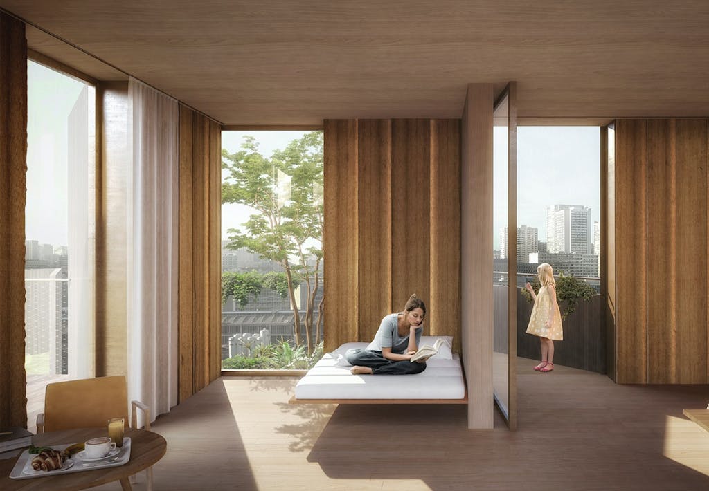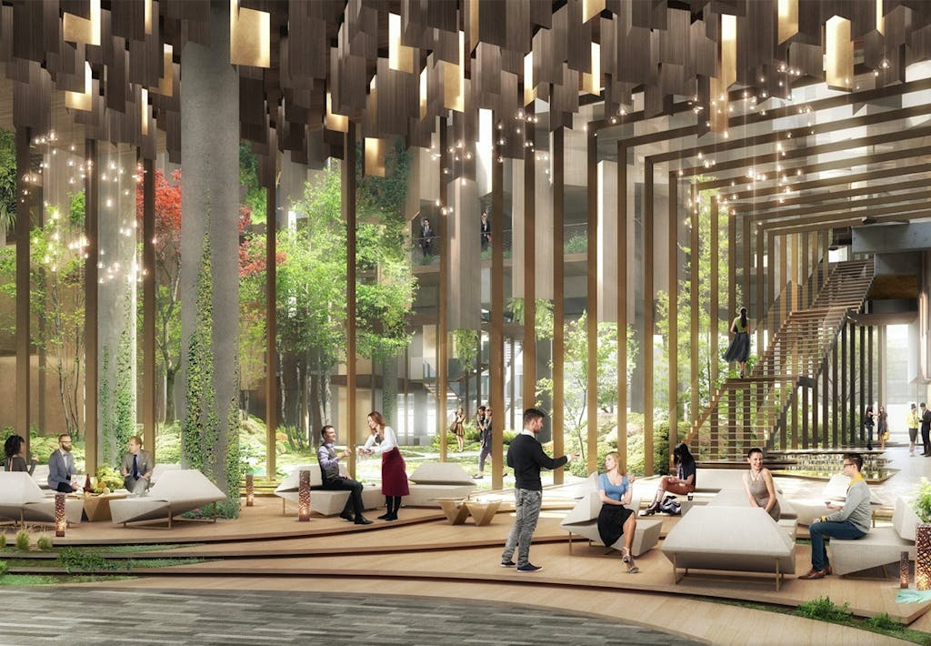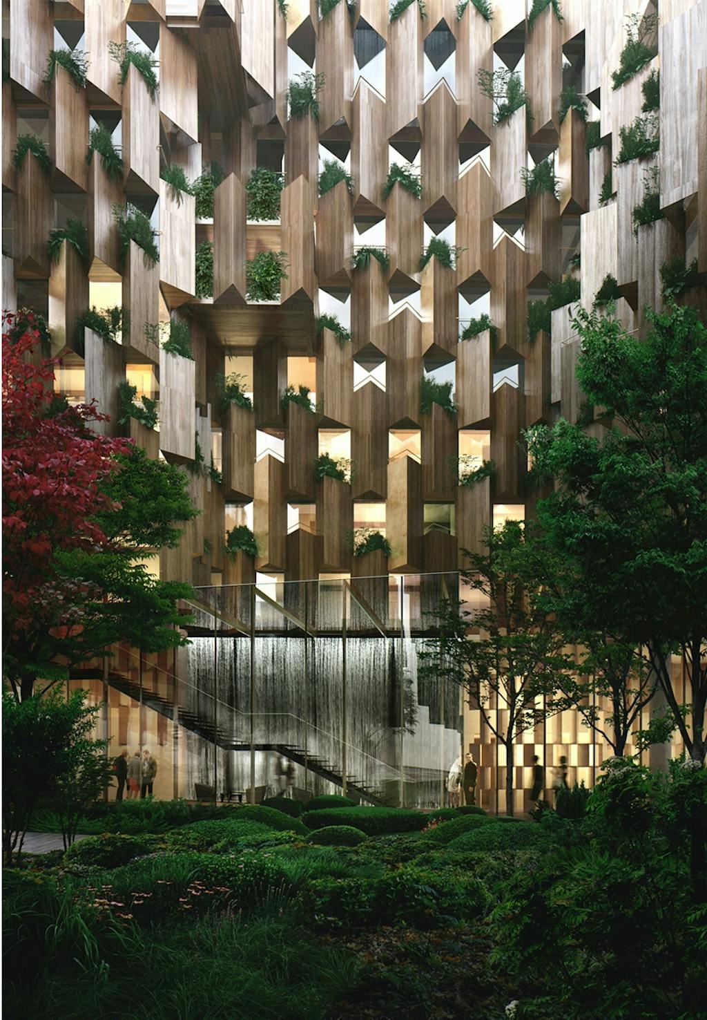 "Vi følte et behov for at skabe en grøn lunge i det tætte bydistrikt", forklarer Kengo Kuma. "Naturen finder sin plads i kernen af byggeriet - i en intim offentlig have, hvor alle sanser vækkes."