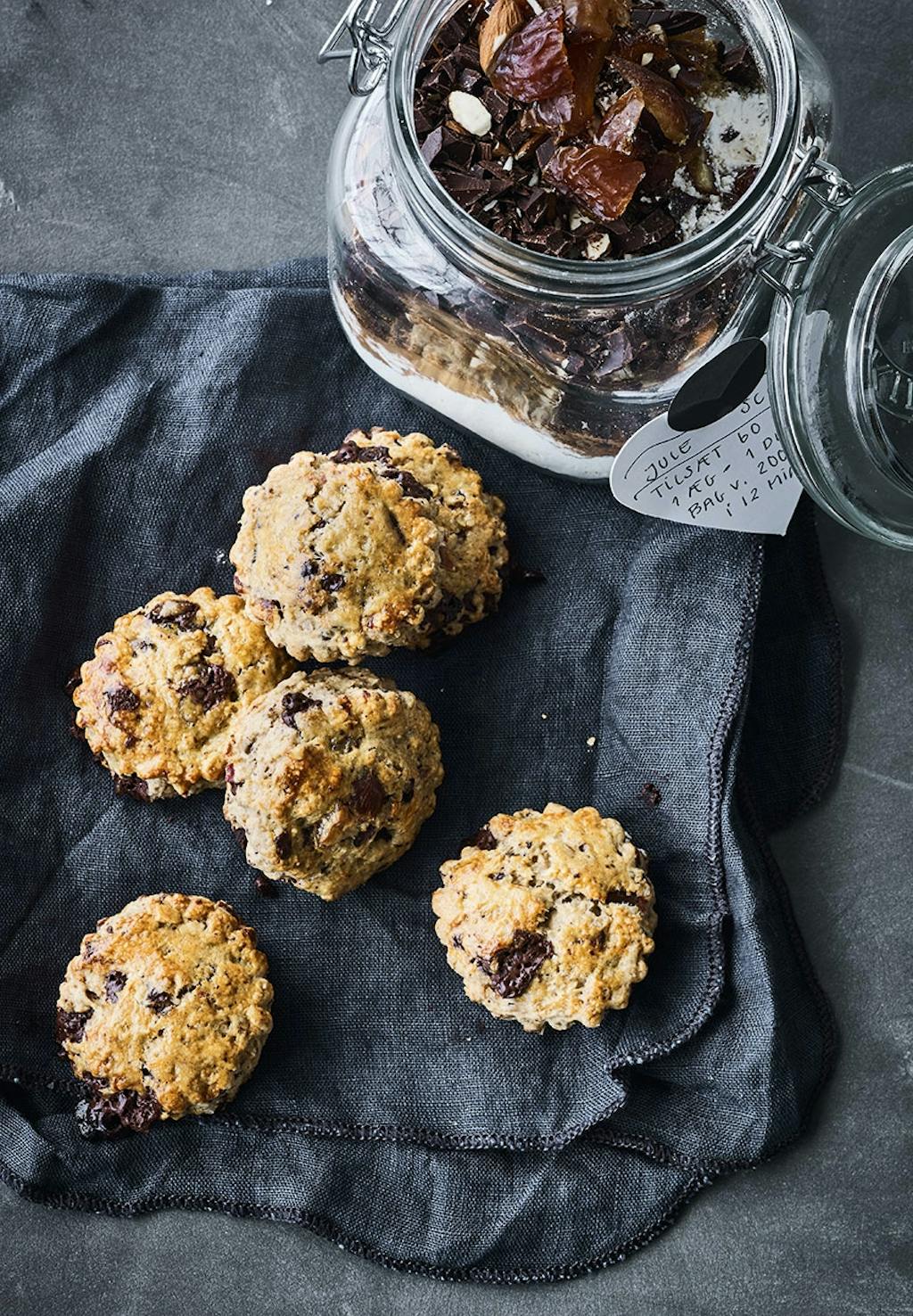 - Bland mel sammen med bagepulver, sukker, salt, kanel, kardemomme, hakket chokolade, hakkede mandler og hakkede dadler.