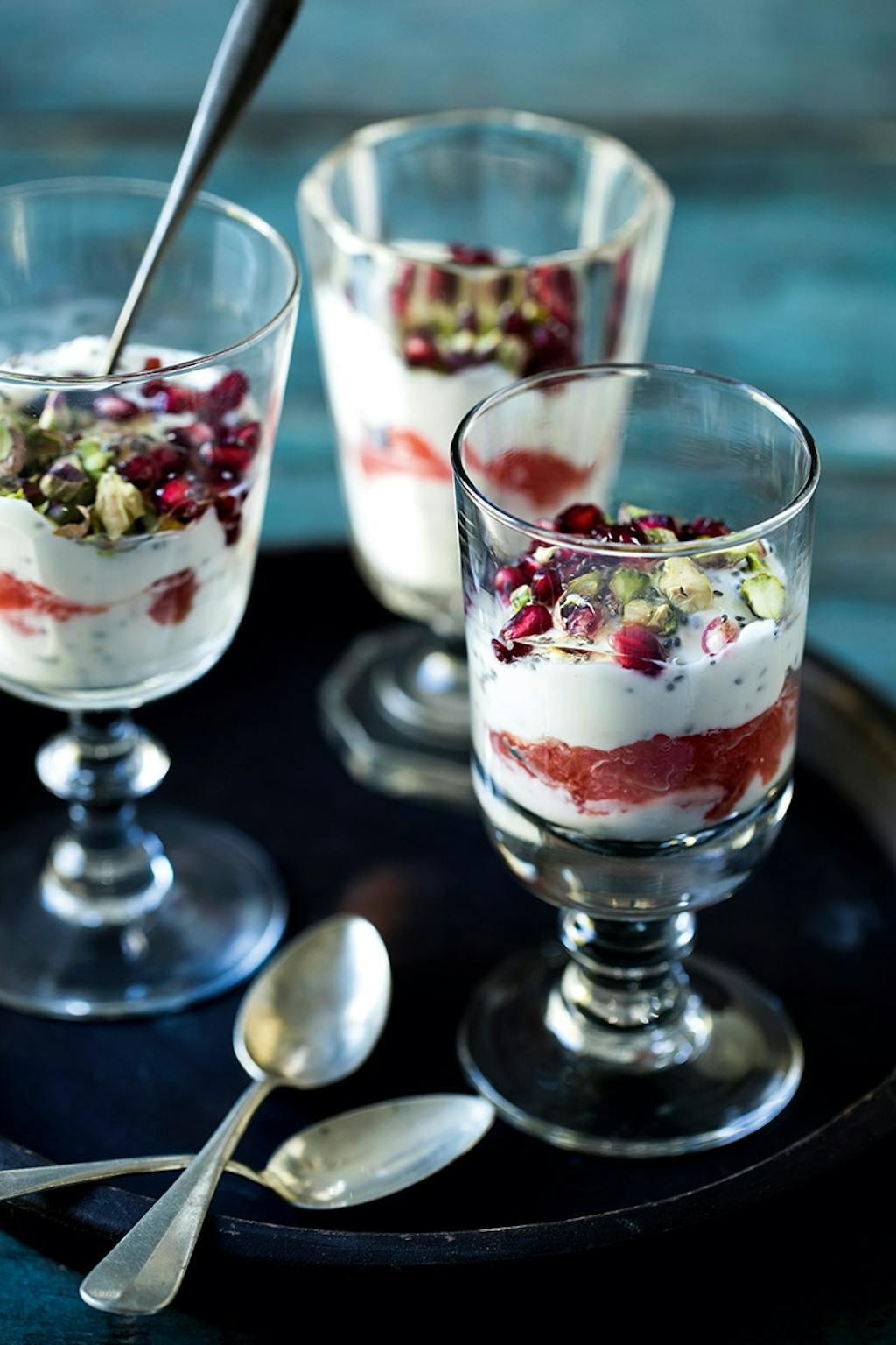 Rør yoghurt med chiafrø, og fordel lagvis i glas med grapefrugt og pistacienødder i 4 skåle.