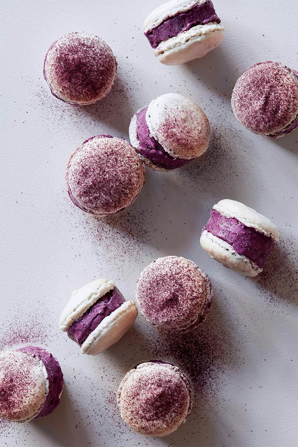 Dessert Blåbær-macaron-iskager De lækre macaron-iskager kan med fordel laves i god tid. Af Gitte Heidi Rasmussen — 25. juni 2019 © Stine Christiansen Blåbær-macaron-iskager Ca. 12 små iskager Det skal du bruge: Is 4 past. æggeblommer 75 g sukker ½ stang vanilje 1½ dl sødmælk 100 g hvid chokolade 200 g blåbær 3 dl piskefløde Macarons 100 g mandelmel 150 g flormelis 75 g æggehvide 50 g sukker 1 spsk. blåbærpure Sådan gør du: Pisk æggeblommer, sukker og vaniljekorn luftigt. Varm mælk og fløde op til kogepunktet. Hæld det langsomt og under piskning i æggemassen. Varm blandingen op under omrøring, til den er let cremet. Den må endelig ikke koge. Si den evt. Hak chokoladen, og smelt den i den varme creme. Sæt den til afkøling. Mos blåbærrene, brug en stavblender, og rør blåbærmosen i iscremen, gem 1 spsk. til kagerne. Frys iscremen i en ismaskine. Pisk æggehviderne luftige, næsten stive, tilsæt sukker og pisk, til æggehviderne er stive. Bland mandelmel og flormelis, og vend det i æggehviderne. Slå samtidig lidt af luften ud af hviderne, indtil massen er ensartet. Kom makronmassen i en sprøjtepose med en ca. 10 mm tylle, eller brug en plasticpose, og klip et hul på 10 mm i diameter. Sprøjt makronerne ud til små runde kager på en bageplade med bagepapir, 24 stk. Lad makronerne tørre mindst 20 min., og bag dem ca. 20 min. ved 140 °. Lad dem hvile et par minutter, inden de pilles af bagepapiret. Par dem størrelsesmæssigt, samtidig med at de lægges til afkøling på bageristen. Læg makronerne sammen med små iskugler, og opbevar dem i fryseren, indtil de skal spises. Drys evt. med lidt blåbærstøv. Relateret Julemad Opskrift på Gateau au chocolat med appelsin og granatæble Dessert Marengs med lemoncurd og hvid chokolade Dessert Opskrift på 4 hjemmelavede ispinde med mango, blåbær, jordbær og ananas Dessert Opskrift på overdådig mandelkage med luftigt skum og friske bær Julemad Opskrift på engelsk julekage med sauce af romkaramel Dessert Opskrift på hvid tiramisu med et syrligt twist