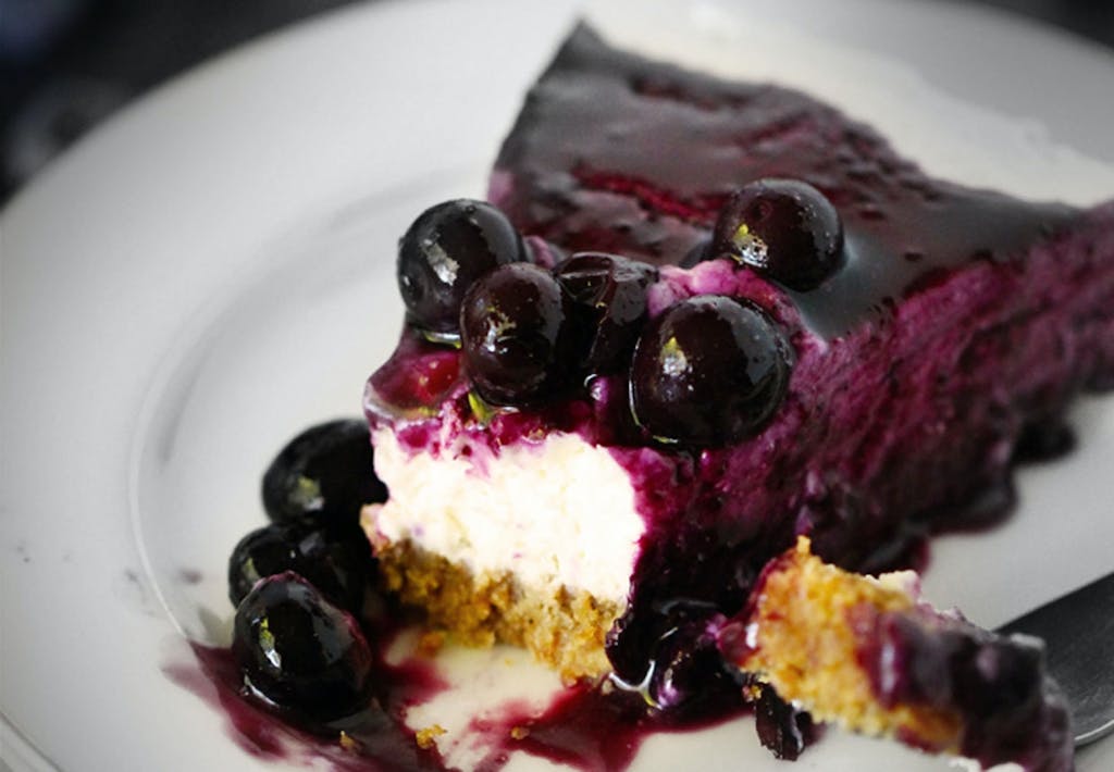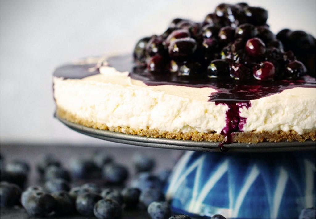 Cheesecaken er lavet på en bund af ingefærkiks, som giver en fint modspil til den ellers cremede kage. Fyldet består af ingredienser som gedeost, vanilje, flødeskum og en lille smule honning. Til topping har Chelsea lavet en blåbærkompot af friske bær.