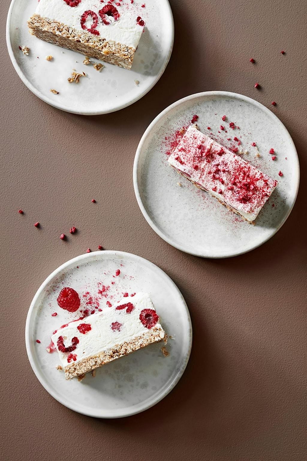 Dessert Hindbærcheesecake-isbar Hvis du er vild med cheesecake, så prøv denne is-version. Af Gitte Heidi Rasmussen — 21. juni 2019 © Stine Christiansen Hindbærcheesecake-isbar Ca. 12 stykker Det skal du bruge: Bund 150 g havrekiks 100 g smeltet smør 50 g kokosmel 75 g hakkede mandler 250 g hindbær 25 g sukker Is 1 æggehvide 25 g sukker 1 knsp. salt 4 dl piskefløde 100 g sukker 2 past. æggeblommer Sådan gør du: Knus kiksene, og smelt smørret. Vend kiks, kokosmel og mandler i det smeltede smør. Beklæd en bageform ca. 18 x 25 cm med plastfilm. Kom kikseblandingen i bunden af formen, og tryk det sammen. Sæt det i køleskabet, indtil bunden er fast. Vend bærrene i sukker. Pisk æggehviden stiv, tilsæt sukker og salt, og pisk, til den er sej. Pisk fløden til luftig flødeskum. Pisk æggeblommer, sukker og vaniljekorn til en luftig æggesnaps. Vend flødeskummet og marengsen i. Vend bærrene i iscremen, kom den ud på bunden, glat overfladen, og sæt isen i fryseren, til den er fast, ca. 2-3 timer. Skær isen i aflange stykker. Drys evt. med frysetørrede hindbær, og servér. Tip: Kan laves med alle slags bær, men skær store bær i mindre stykker, og sørg for, at de trækker mindst 30 min. drysset med sukker. Relateret Indretning Glasfliserne er tilbage – men slet ikke som du husker dem: Se her, hvordan du kan bruge dem Julemad Opskrift på Gateau au chocolat med appelsin og granatæble Arkitektur Nye retningslinjer for dansk arkitektur skal forhindre tankeløst og udskældt nybyg: Se de 8 nye dogmer her Lejligheder Monica har et helt særligt aftenritual, der forvandler den store lejlighed fuldstændig Jul Hjemme hos Cecilie er julebordet sønderjysk og farverigt – men én farve fylder allermest Julemad Opskrift på engelsk julekage med sauce af romkaramel