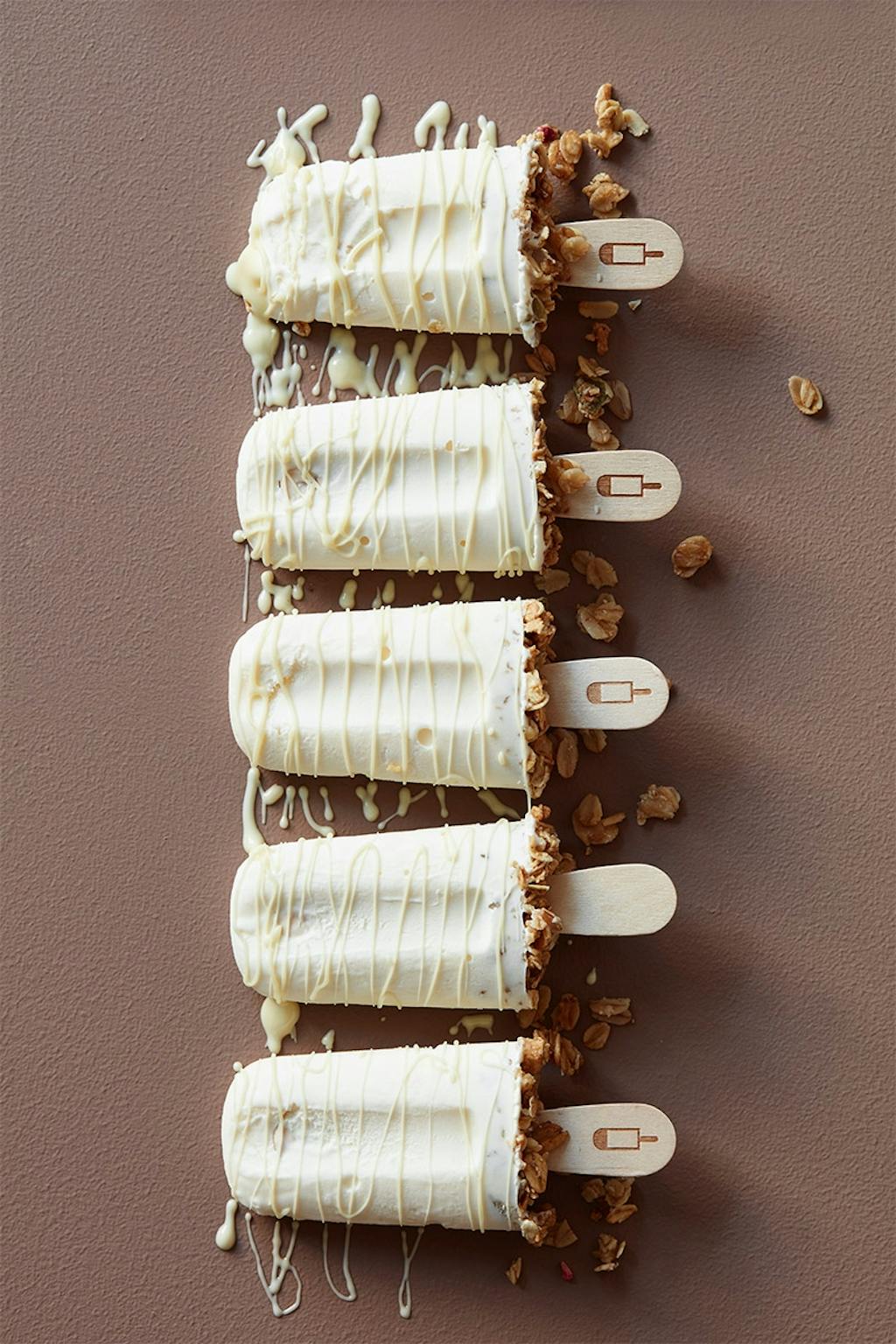 Slut af med granola, og sæt en pind i hver. Kom isene i fryseren, til de er helt faste.