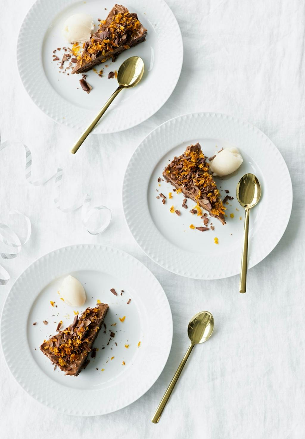 Vi takker den franske kok Michel Michaud for denne lækre kageopfindelse. Efter en tur i fryseren bliver kagen endnu mere uimodståelig. Opskriften på både kage og sorbet rækker til ca. 8 personer, måske flere afhængig af appetitten.