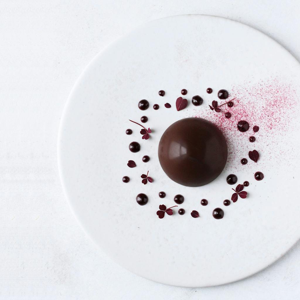 - Pynt med lidt frysetørret solbærstøv i den ene side af tallerkenen - evt ved hjælp af en lille si.