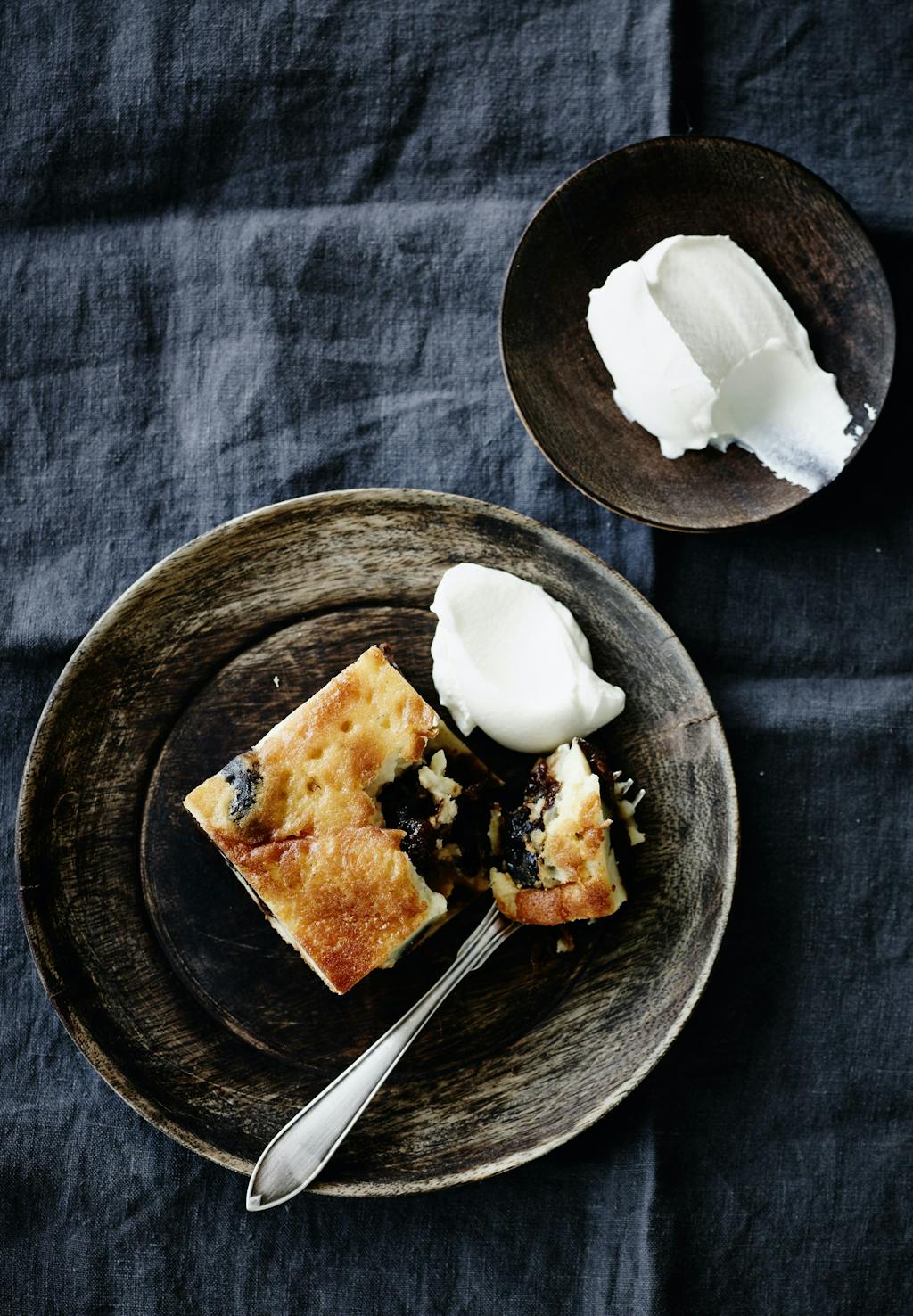 Fordel sveskerne ligeligt over hele overfladen. Lad dem falde lidt ned i dejen.