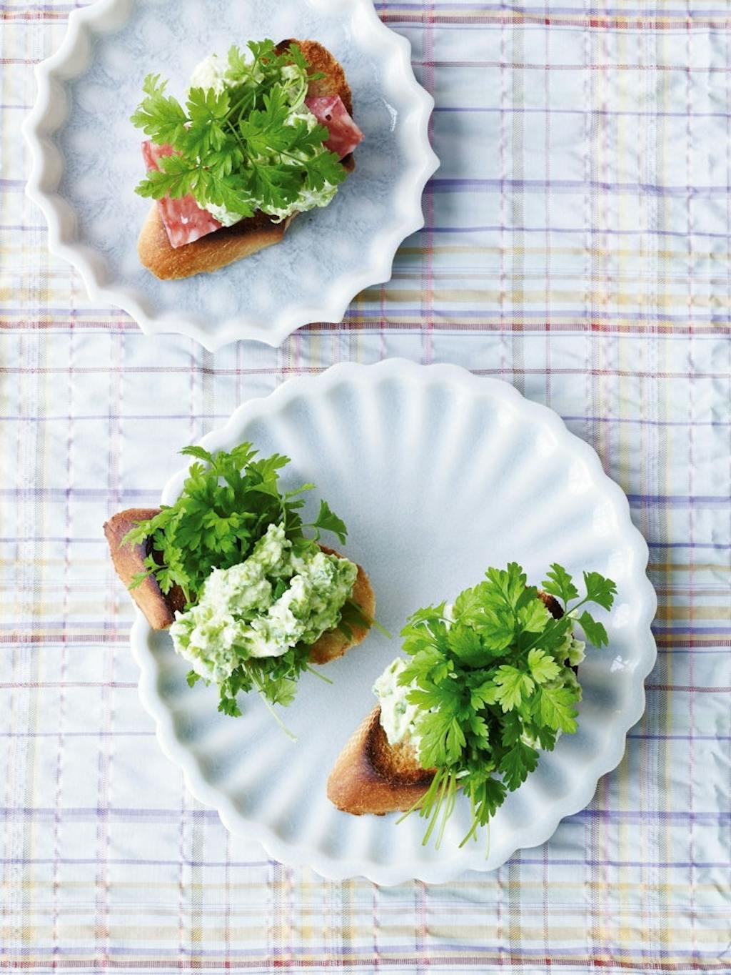 Anret ærtecreme og kørvel på de små brød. Nogle med salami, og nogle uden.