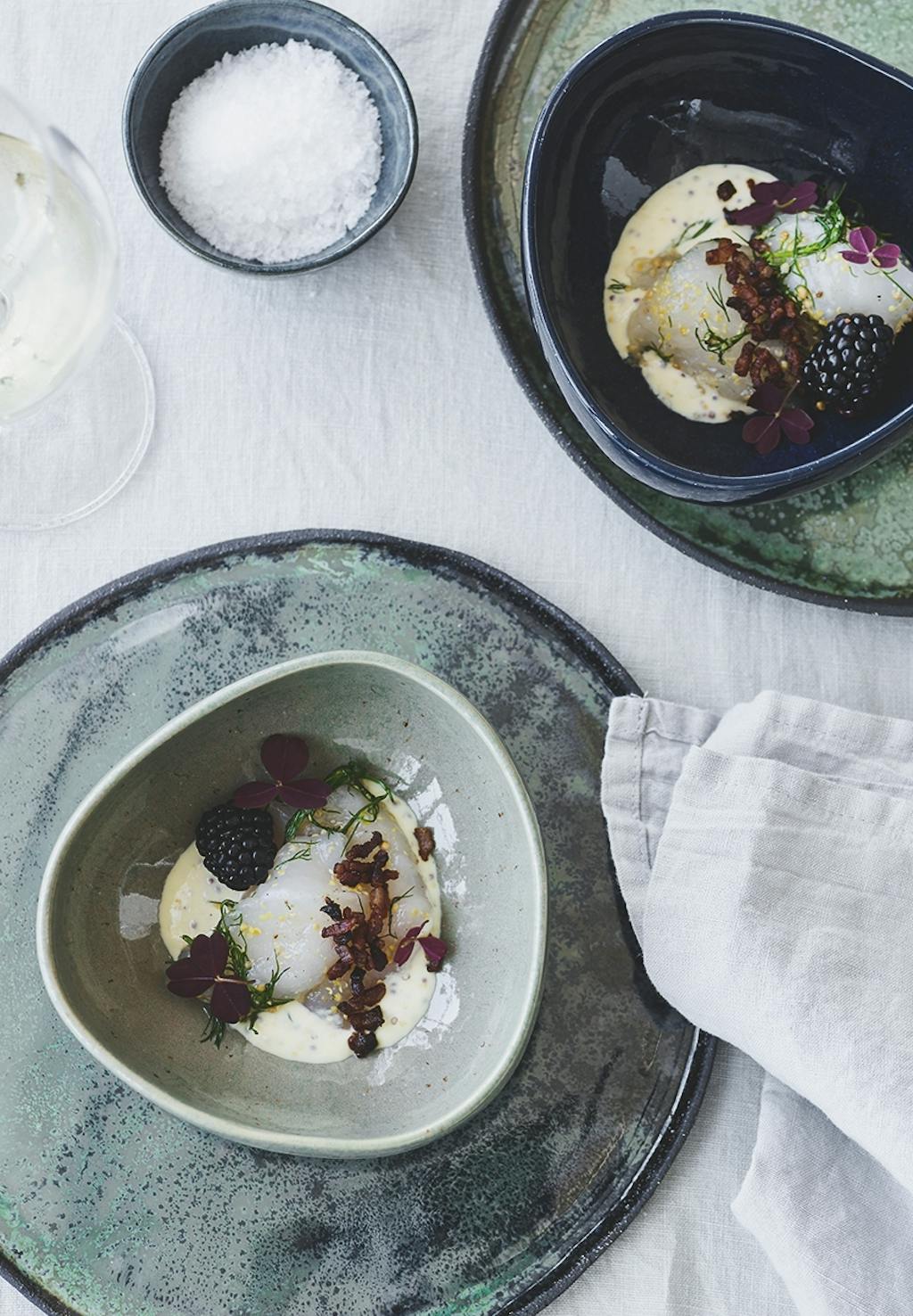Rimmet havtaske med sennepsfløde, brombær og baconknas