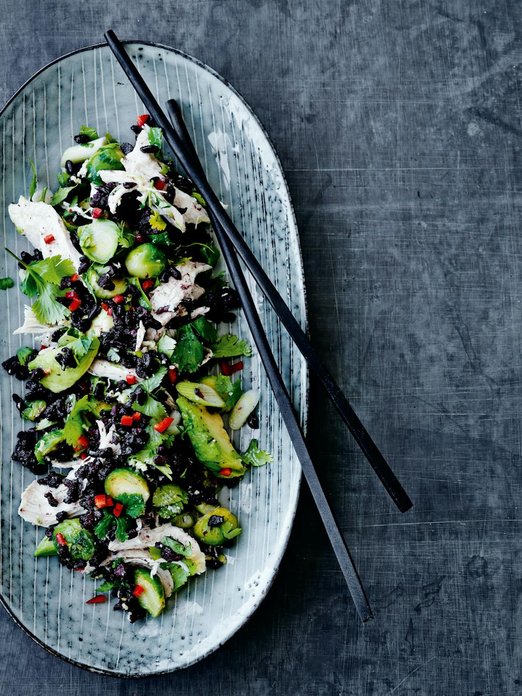 - Vend ris med kylling, rosenkål, advokado og koriander, og dryp dressing over. Smag salaten til med sesamolie og peber, og top med forårsløg.
