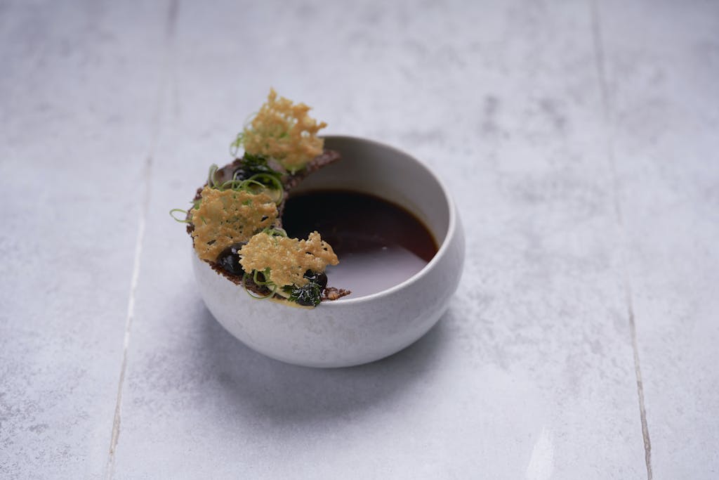 - Placer forsigtigt en pyntet rugbrødshalvmåne på kanten af hver af skålene med chawanmushi. Server straks, og spis med ske.