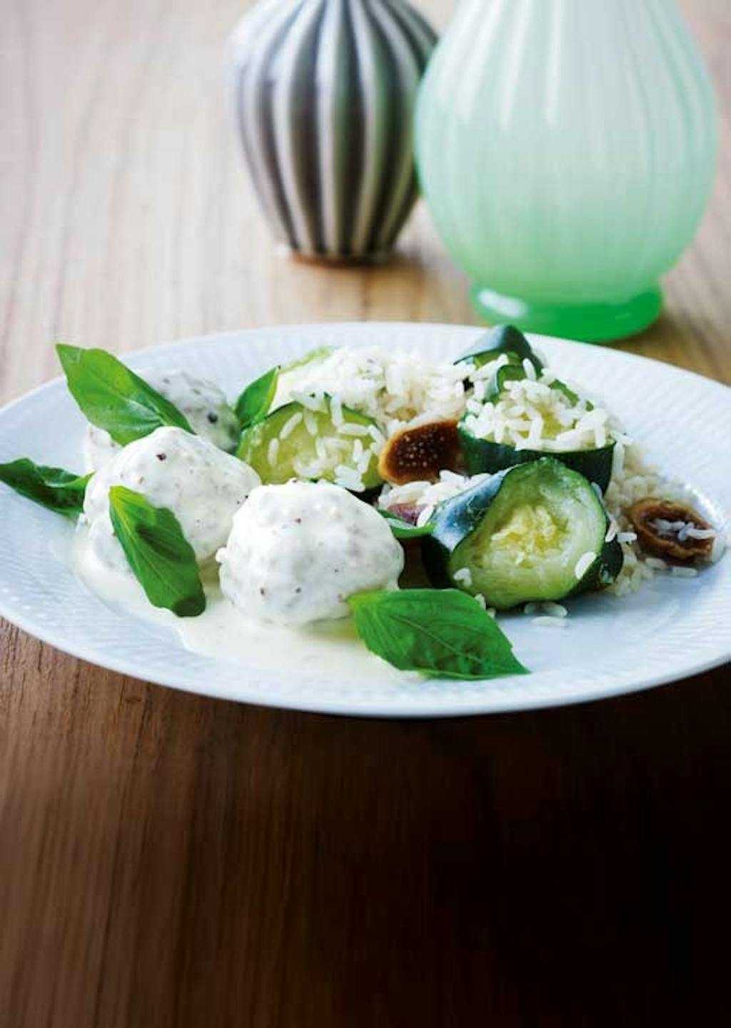Skær figner i skiver, og vend med afdryppede courgetter. Server til ris, kødboller og sauce.