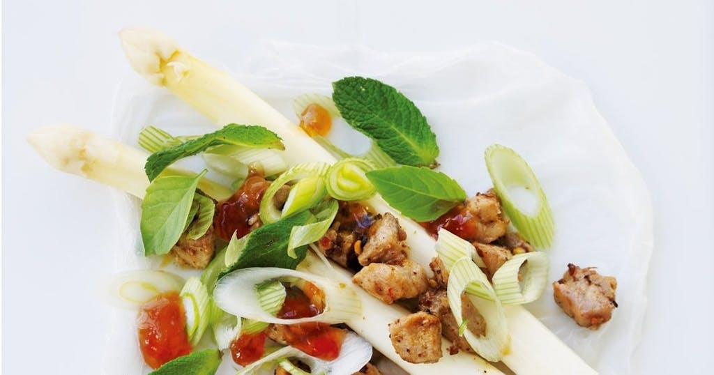 - Skyl det i koldt vand, og læg det på et rent viskestykke. Fordel asparges, kød, forårsløg, mynteblade og basilikumblade herover, og dryp lidt chilisauce på.