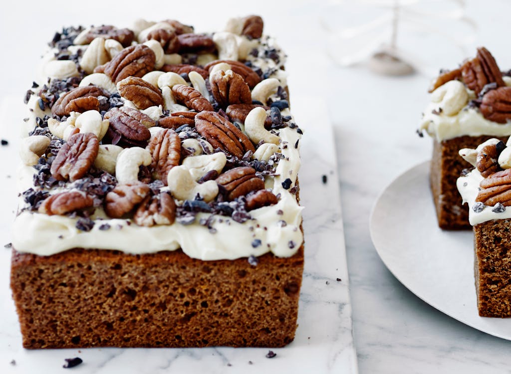 Honningkage med lakridscreme, nødder og kakaonibs