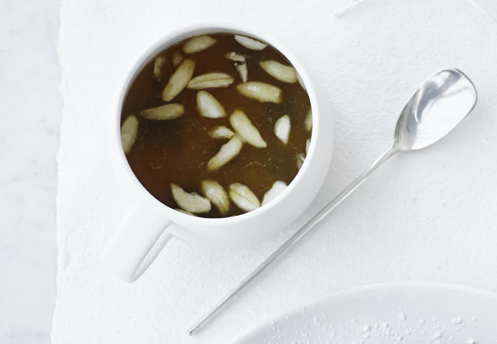 • Kom appelsinsirup, hvidvin, rosiner og mandler i en gryde, og varm op til kogepunktet.