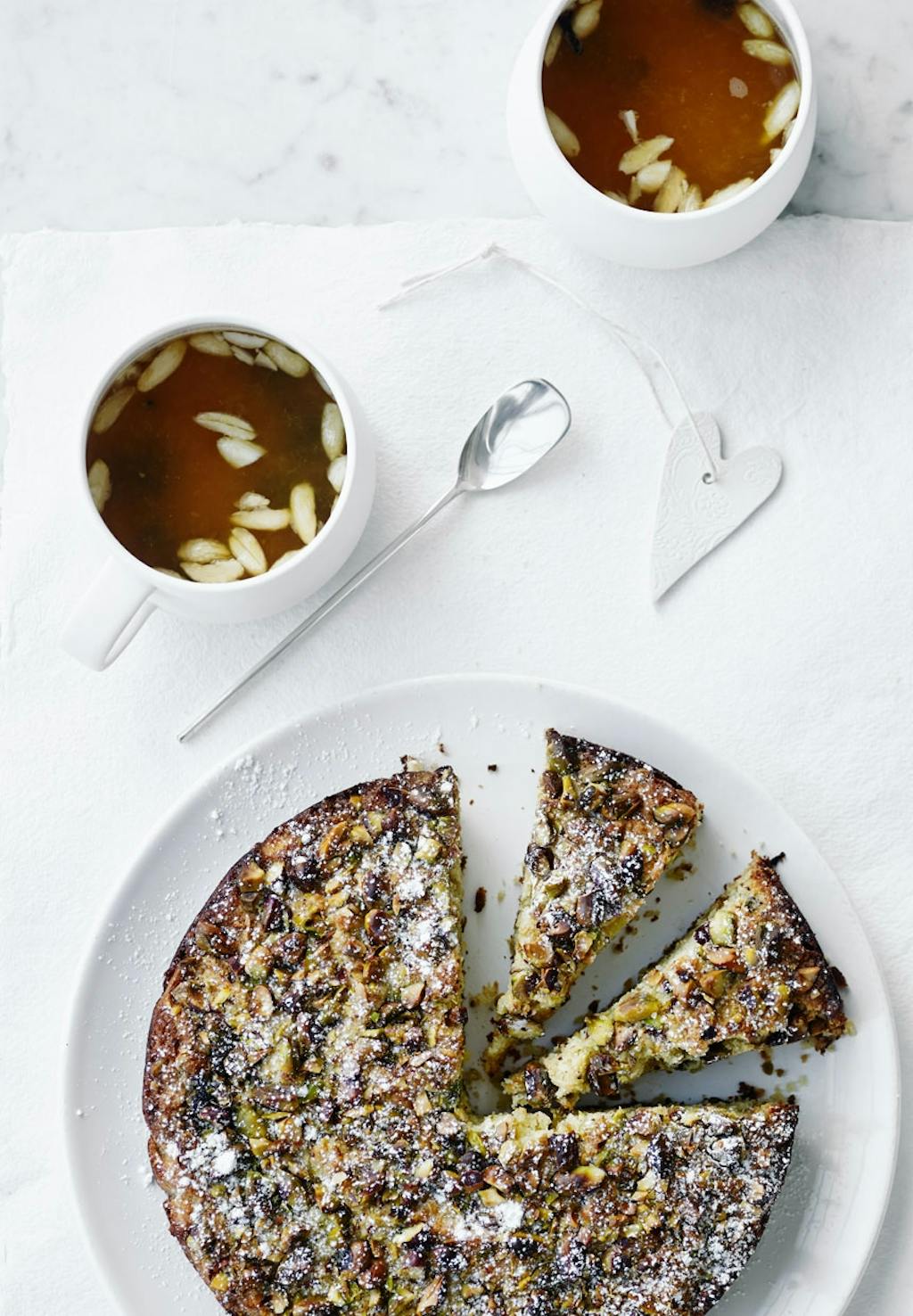 Denne kage er helt fantastisk med en skøn smag af lime og pistacienødder.