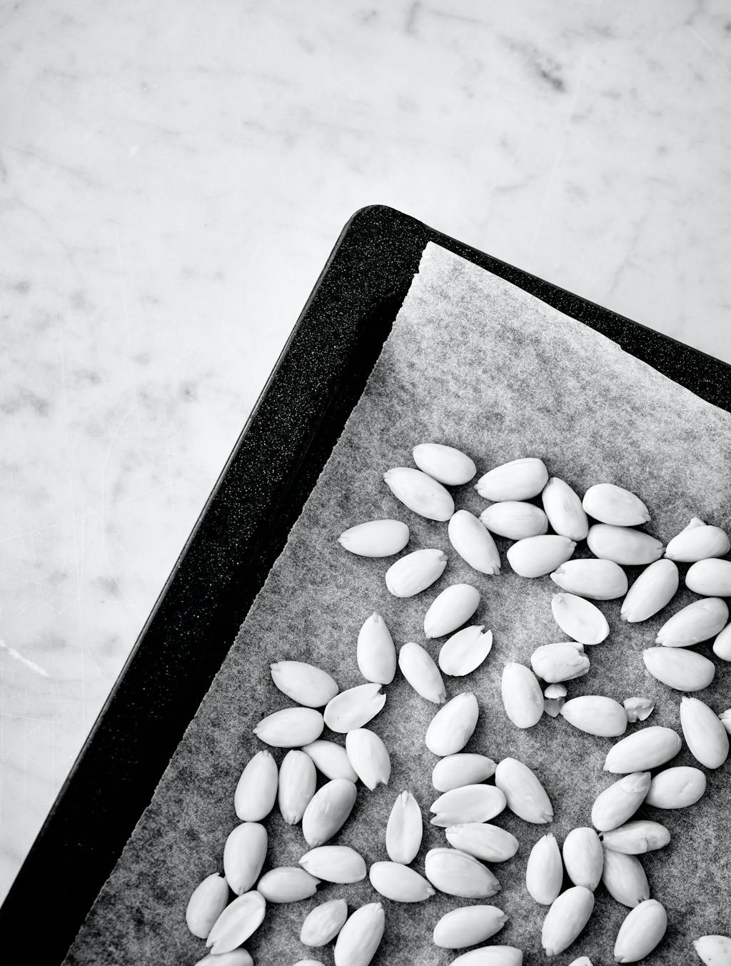 - Fordel mandlerne på en bageplade, og rist dem i ovnen ved 180 grader i ca. 5 min.
