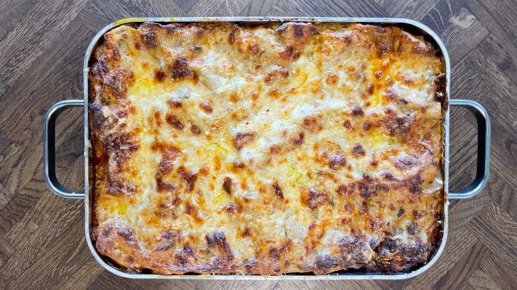 Omtrent 45 min på 180 grader burde få dig i mål med en sublim umami-bombe af en lasagne, estimerer han.